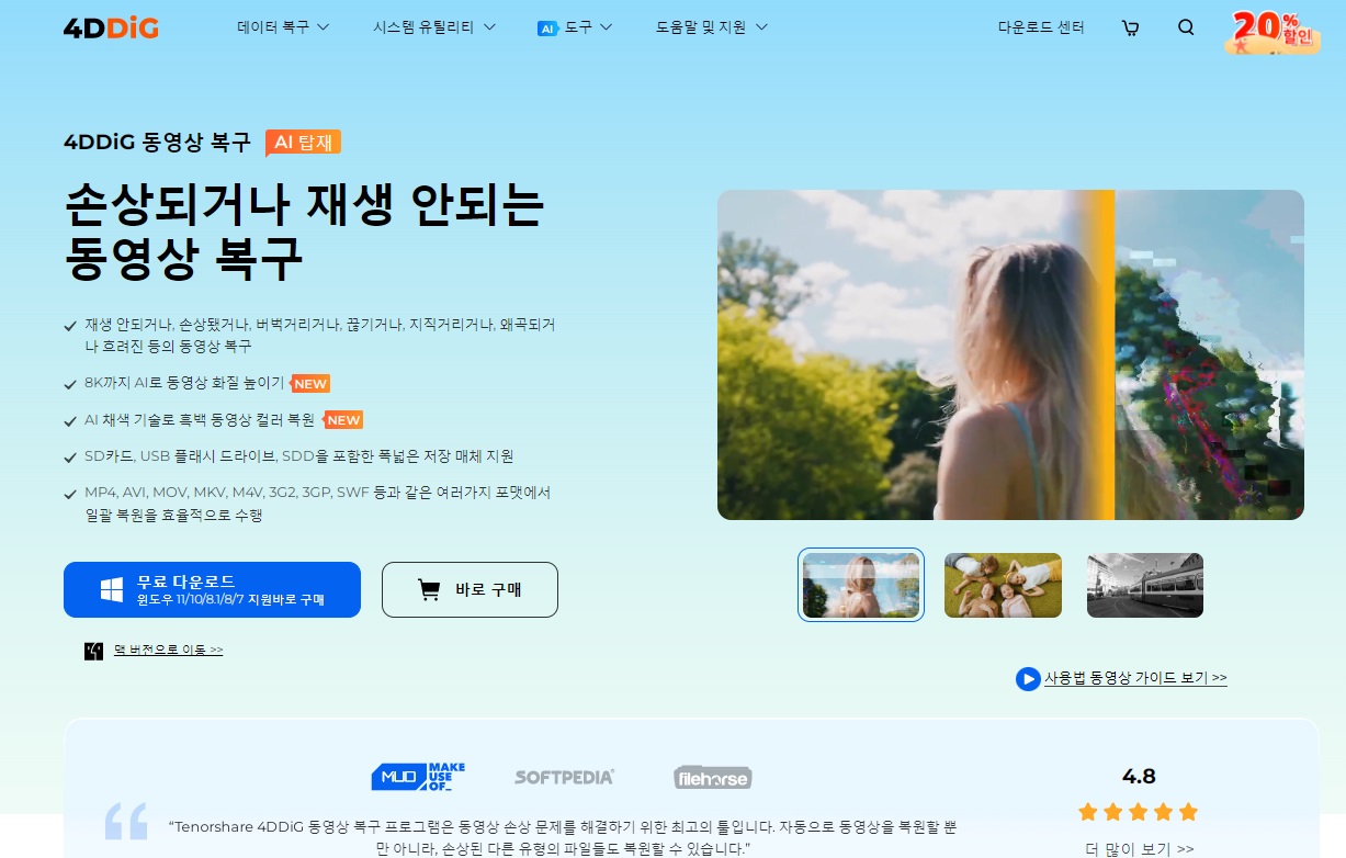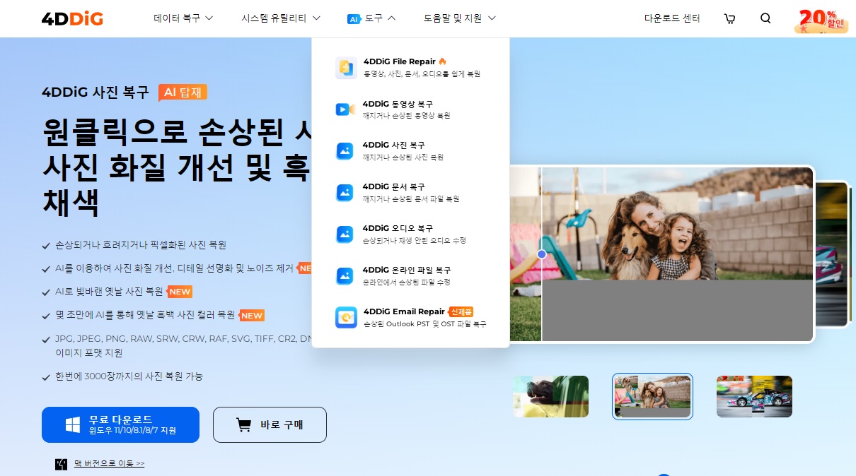 손상된 파일 복구 프로그램 중 몇 가지만 소개하면 먼저 4DDiG 사진복구(AI탑재) 프로그램을 이용하면 손상되거나 흐려진 사진을 복원할 수 있고 AI를 이용하여 디테일한 복원할 수 있게 업그레이드된 부분이 달라진 점입니다.