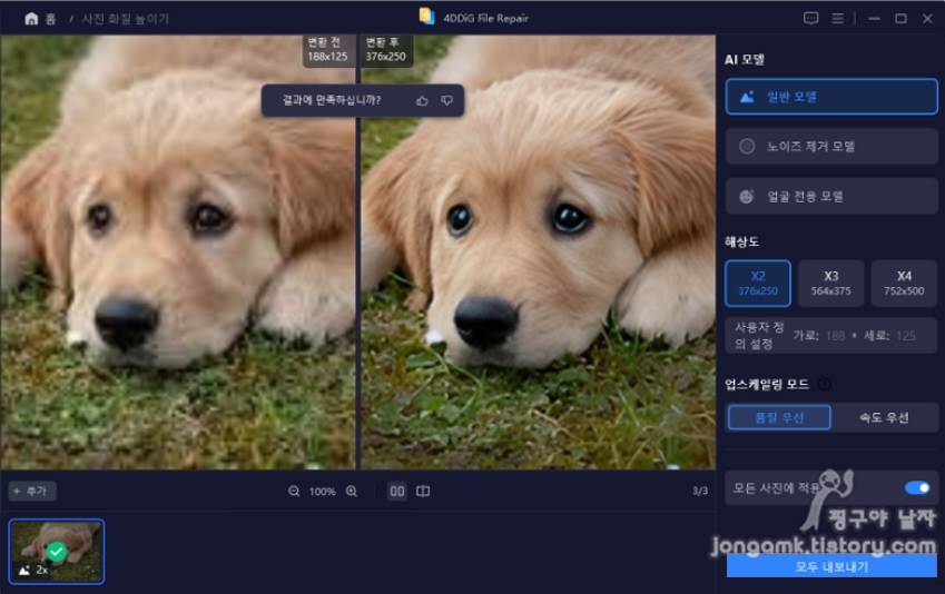 추가로 복구한 사진이나 동영상의 화질을 개선하고 싶을 경우가 있는데요. 심하게 흔들린 사진이나 동영상을 제외하고 우의 사진 정도의 흐릿함은 4DDiG File Repair(포디딕 파일 복원 프로그램)의 화질 높이기 기능으로 개선된 화질로 만족도를 높일 수 있습니다. 풀프레임으로 촬영한 정도의 화질은 아니지만 이 정도의 화질 개선이라면 괜찮은 것 같아요.