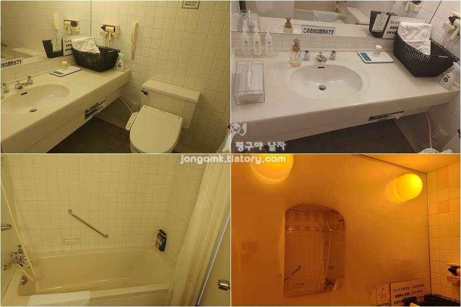 욕실의 모습입니다. 헤어드라이기는 제공되며 손을 닦는 경우 휴지로 물기를 닦게 되어 있습니다. 대형 타월과 수건을 가지고 온천을 즐기면 되고 1박인 경우는 말려서 다음날에도 사용해야 합니다. 수압을 마음에 들었으며 욕조를 사용하더라도 거울에는 습기가 차지 않아 이용하는데 불편함이 없었습니다.