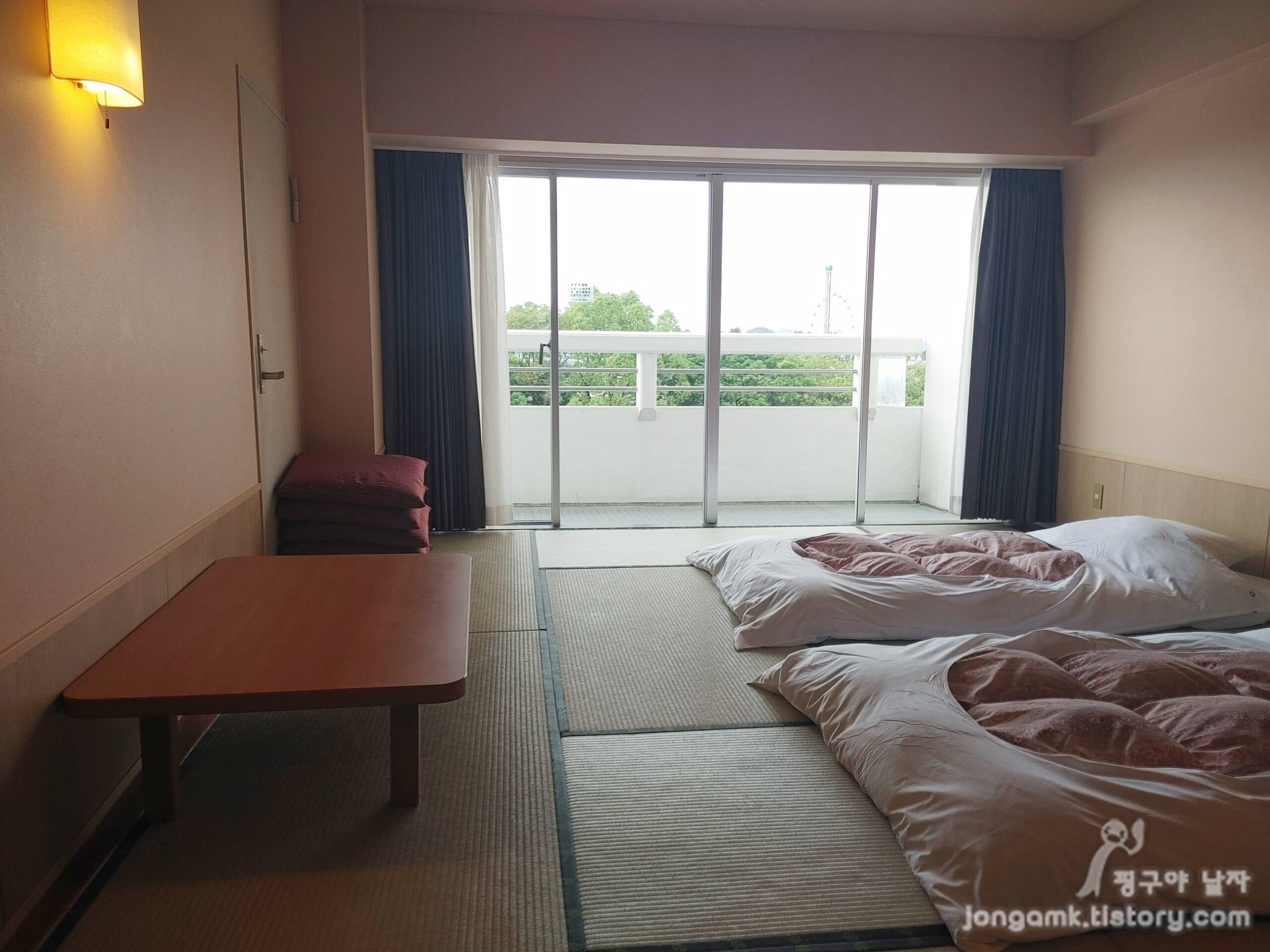 침대방이 아닌 다다미방으로 호불호가 갈리는 숙소지만 특별히 가리지는 않아 일본여행을 하면서 즐길 수 있는 것이라고 생각했습니다. 호텔 규모에 비해 다소 올드한 시설이 아쉽기는 했습니다.