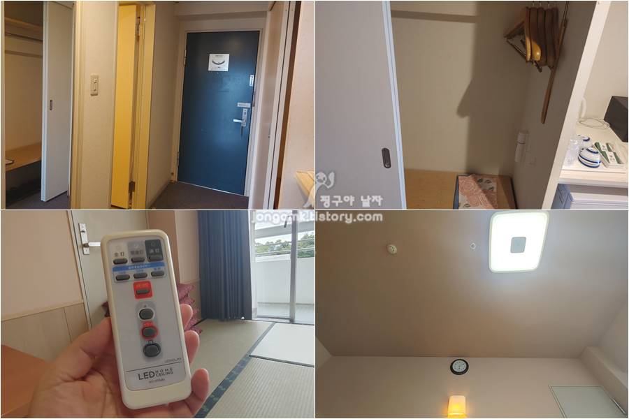 출입구는 열쇠로 문을 열고 닫게 되어 있으며 수납공간에는 옷걸이와 슬리퍼가 있습니다. 온천을 다녀와 누웠는데 전등을 리모컨으로 밝기와 On/Off를 컨트롤할 수 있어 너무 편했어요.
