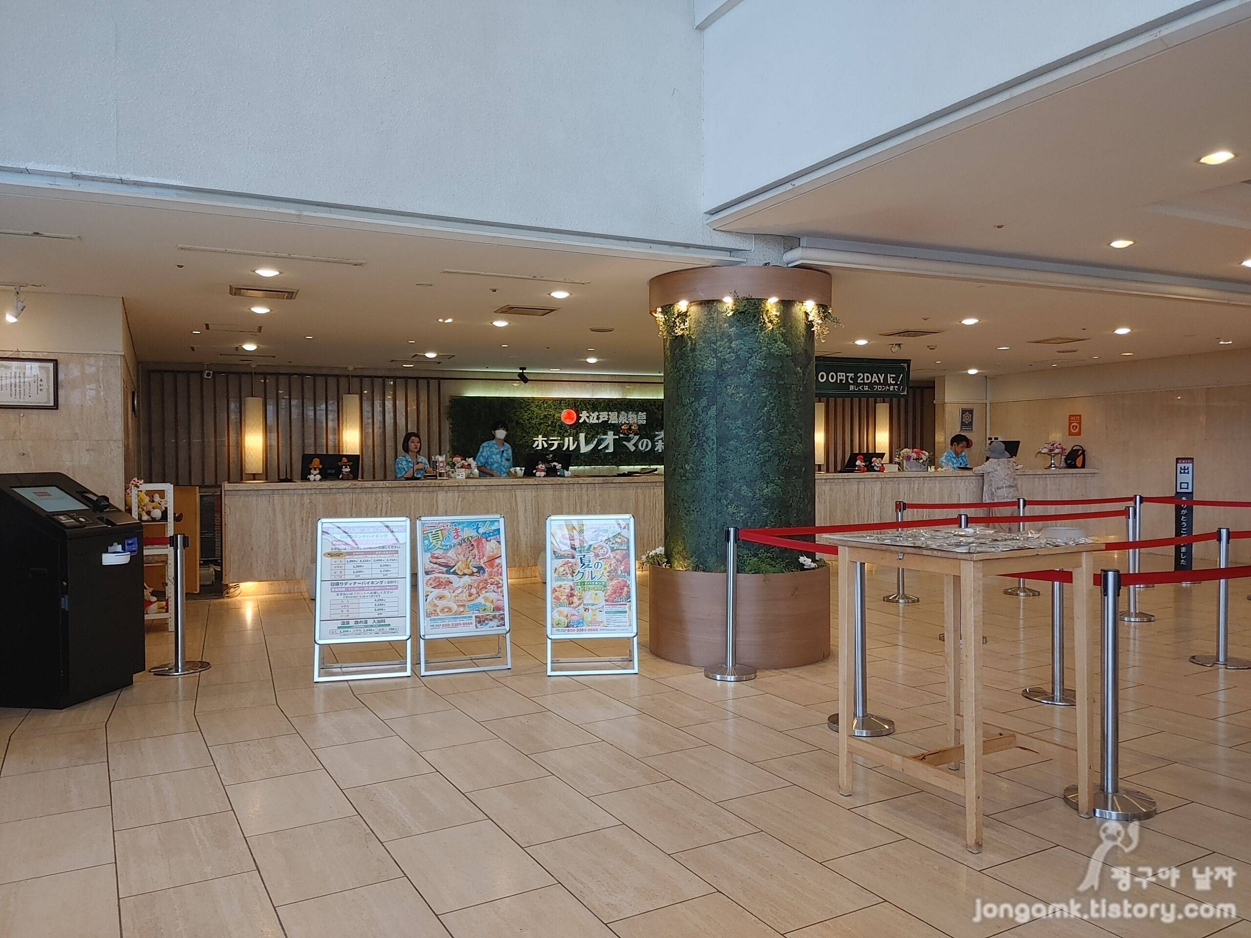 레오마노 모리 호텔의 로비 모습입니다. 호텔의 규모에 비해 카운터는 작은 편이었지만 서비스를 받는 데는 부족함이 없었습니다. 면도기와 빗은 온천탕에서 제공되고 로비에서는 칫솔과 치약만 제공됩니다. 온천을 가지 않는 분들은 직원에게 면도기와 빗을 달라고 말하면 제공합니다. 개량 기모노를 사이즈에 맞는 것으로 선택합니다.