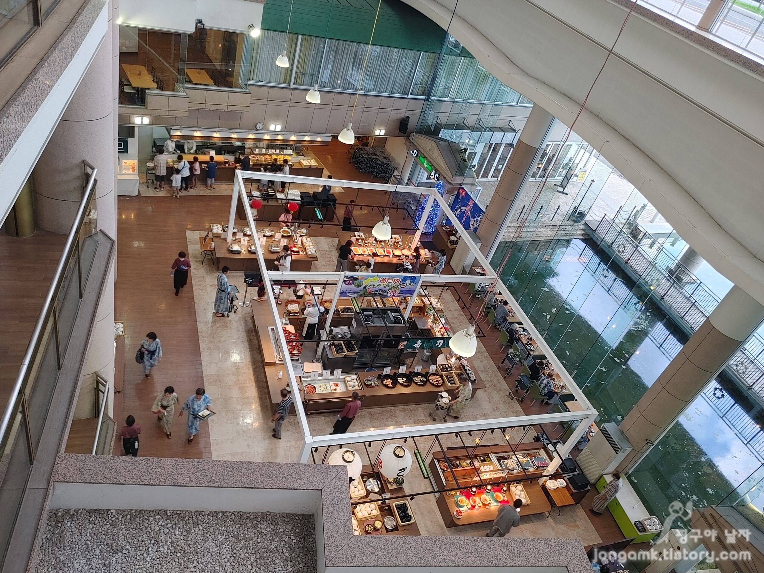 4층 로비 뒷편에 1층에는 식당이 있습니다. 그리고 바깥은 수상 레저 시설이 있어 구경하면서 식사를 했습니다. 출입시간이 정해져 있는 듯합니다. 나가보고 싶었지만 온천과 다른 일정으로 눈으로만 즐겼습니다.