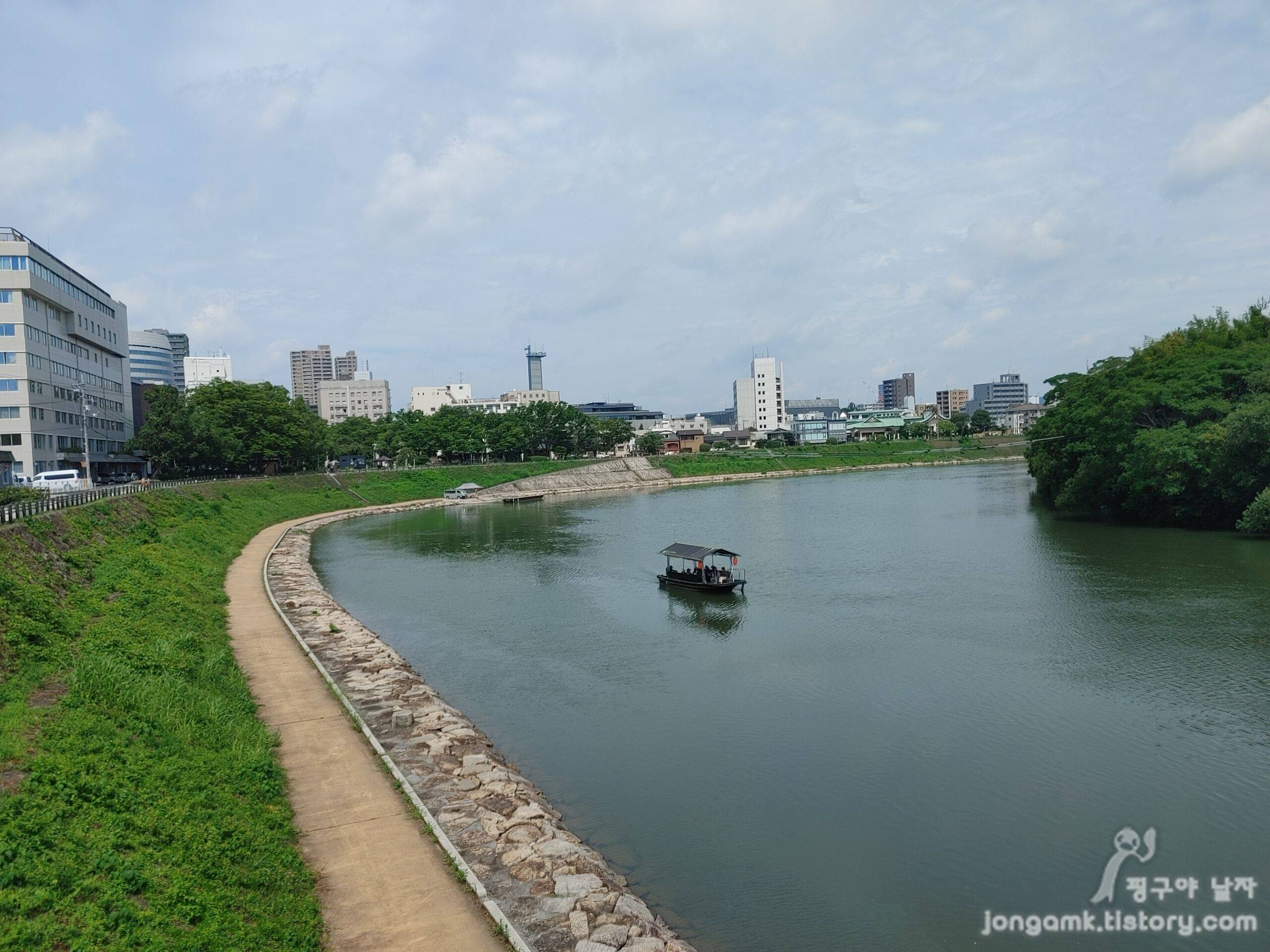 리츠린공원을 가로지르는 긴 하천인지 강 줄기인지 모르지만 관광객을 태운 배가 여유로워 보였습니다. 한국에서는 비가 많이 왔는데 당시 일본에서는 비가 오지 않고 무더운 날씨였지만 가끔 부는 바람에 견딜만했어요.