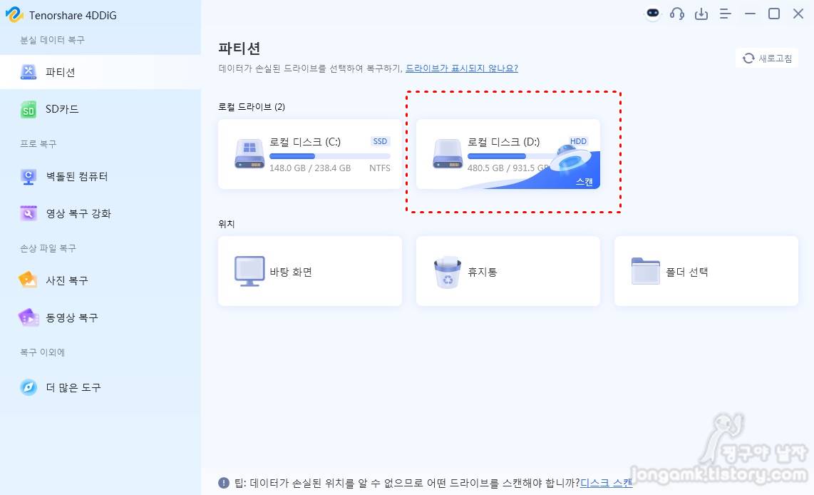사용하고 있는 PC나 노트북에 따라 로컬드라이브가 보입니다. D 드라이브에 있는 한글 파일을 삭제했으니 스캔 위치를 D 드라이브로 선택해야겠죠. 삭제된 파일을 복구하면 당황하기 쉬운데 침착하게 삭제된 파일의 위치를 선택했습니다.
