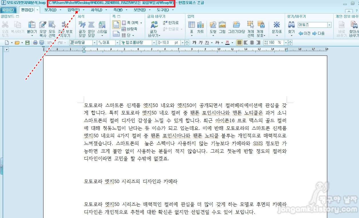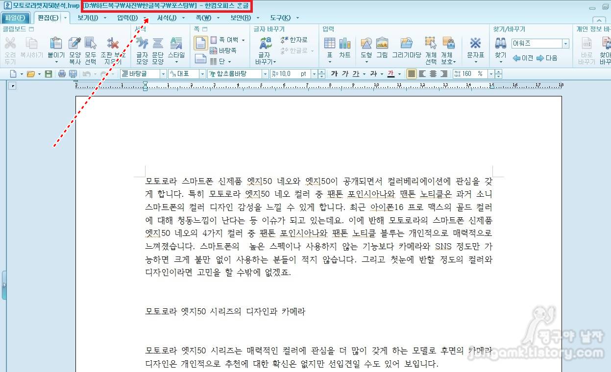 D 드라이브에 개인적으로 작성한 「모토로라엣지50분석」이라는 hwp문서입니다. 원본을 각제하고 C 드라이브에 삭제된 hwp 문서를 복구하는 과정을 테스트해 보았습니다.