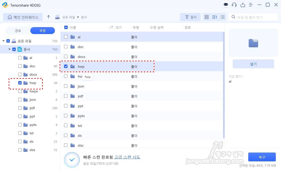 물론 PC와 데스크탑 그리고 다양한 저장장치의 상태에 따라 복구 수준이 달라질 수는 있겠죠. 개인적으로 4DDiG Data Recovery(포디딕 데이터 복구) 프로그램의 다양한 복구 기능 중 한글(hwp 복구) 문서 복구를 직접 복구해 보았습니다.