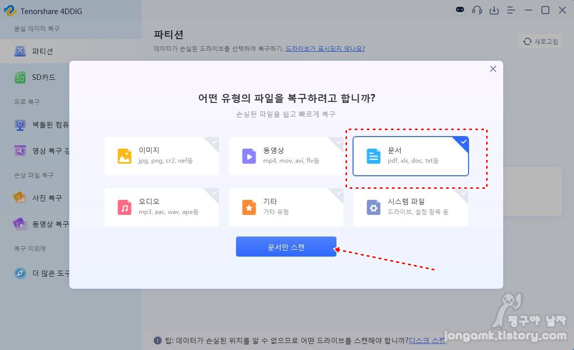 4DDiG Data Recovery(포디딕 데이터 복구) 프로그램은 다양한 파일을 복구해 주는데 이번에는 문서만 복구하기 때문에 문서만 스캔을 시작하였습니다.