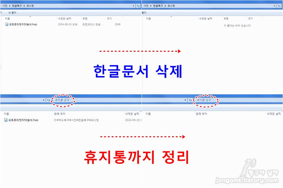 일이 안되려면 삭제하고 꼭 휴지통도 비우게 되죠. 개인적으로는 휴지통을 비우는 일은 좀 늦게 하는 편입니다. 그런데도 문제가 되려면 평상시 패턴대로 행동하지 않게 됩니다. 후회해도 소용이 없죠.