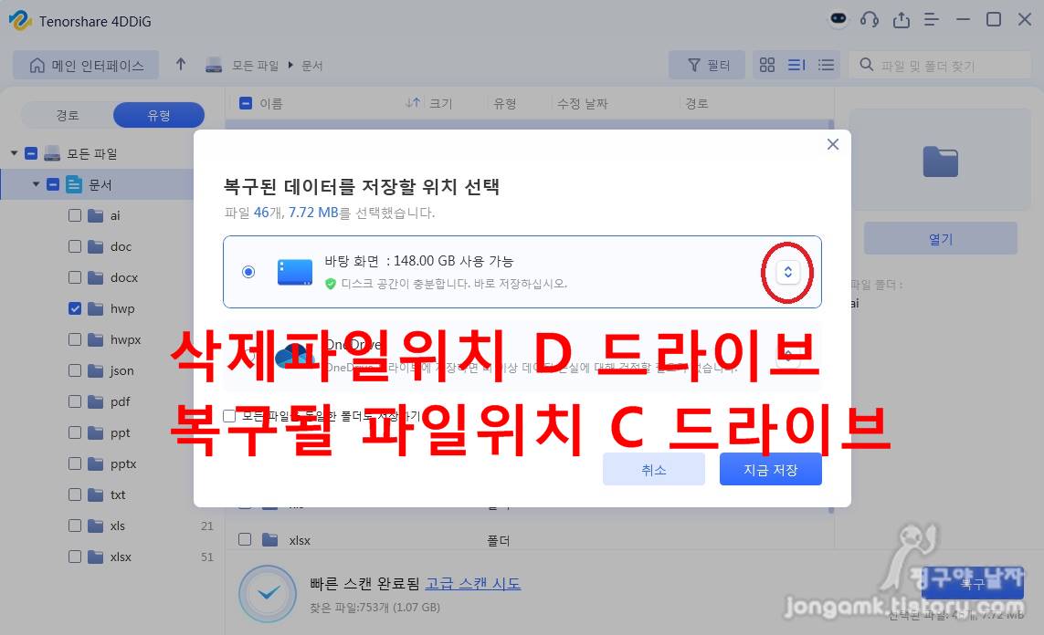 이때 주의사항은 삭제된 드라이브와 물리적으로 분리된 곳으로 복구를 해야 한다는 점입니다. 삭제된 한글문서의 위치인 D 드라이브를 선택하면 안된다는 점입니다. 데이터가 저장되는 메카니즘을 설명하자면 복잡하니 물리적으로 다른 위치를 선택해야 한다는 점만 명심하면 됩니다. 드라이브가 C 드라이브 하나라면 OneDrive 또는 USB등으로 복원하면 됩니다. 개인적으로는 D드라이브에서 삭제되어 C 브라이브 바탕화면으로 선택했습니다.