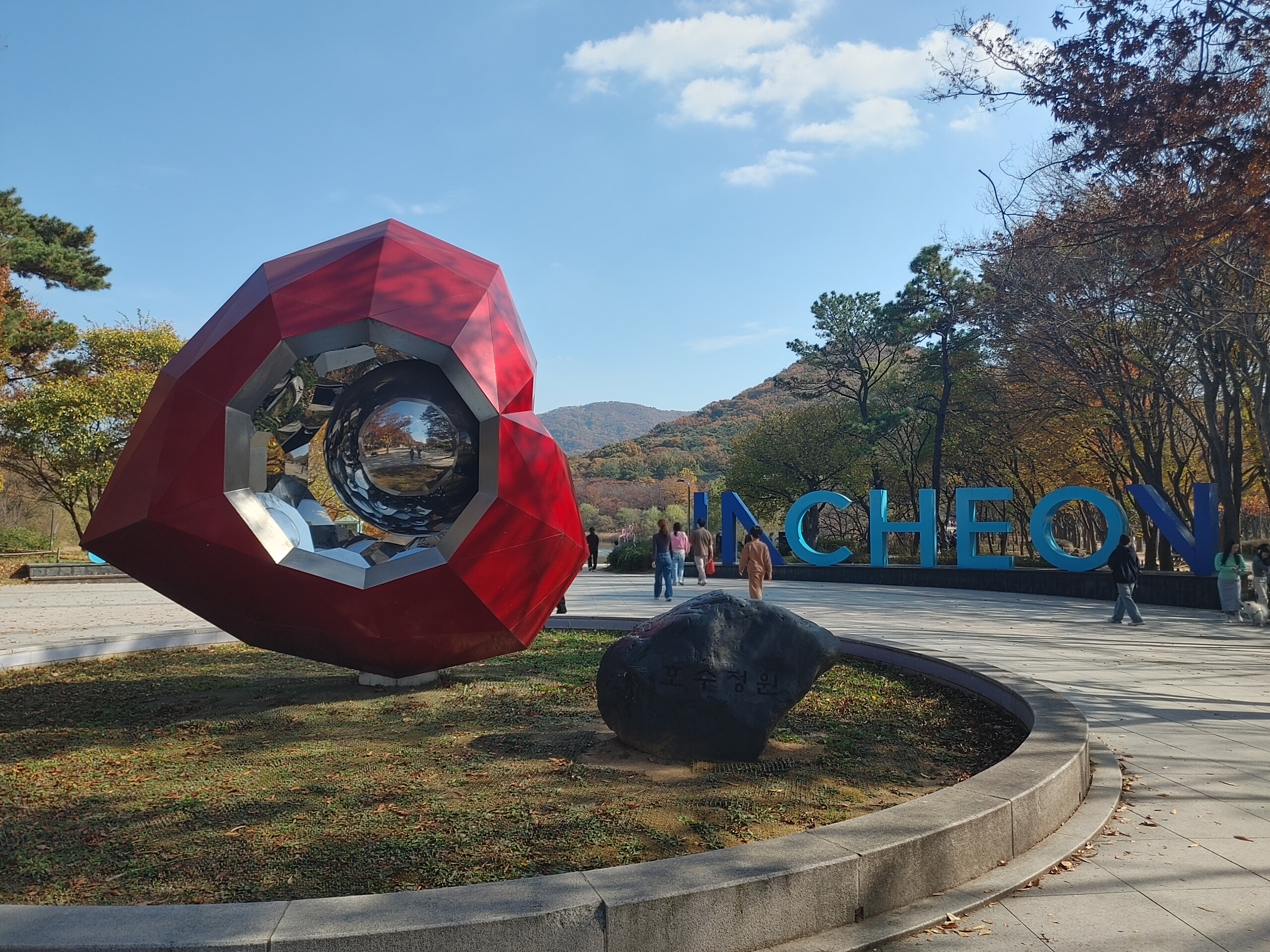 인천대공원이 센터가 되는 광장입니다 하트 모양의 조형물과 영문으로 인천이라고 쓰여 있는 조형물도 보입니다 그리고 펼쳐질 호수는 여유 있는 시간을 보내기에 안성맞춤입니다