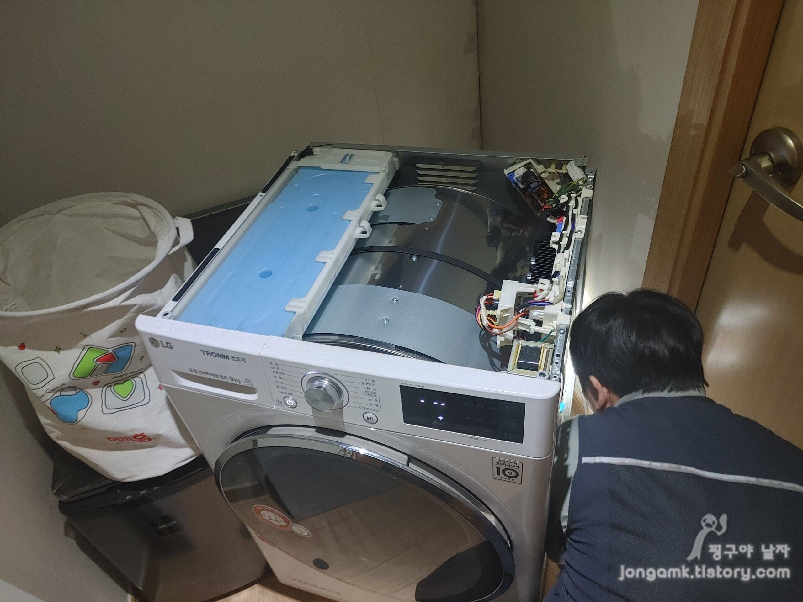 LG전자 A/S 기사님이 엘지 트롬 의류건조기(RH9WG) 원인을 찾는 시간이 길어질수록 수리비에 대한 고민만 깊어지는 거 있죠. 의류건조기 내부의 각종 디바이스를 전체적으로 점검하는 듯했습니다.