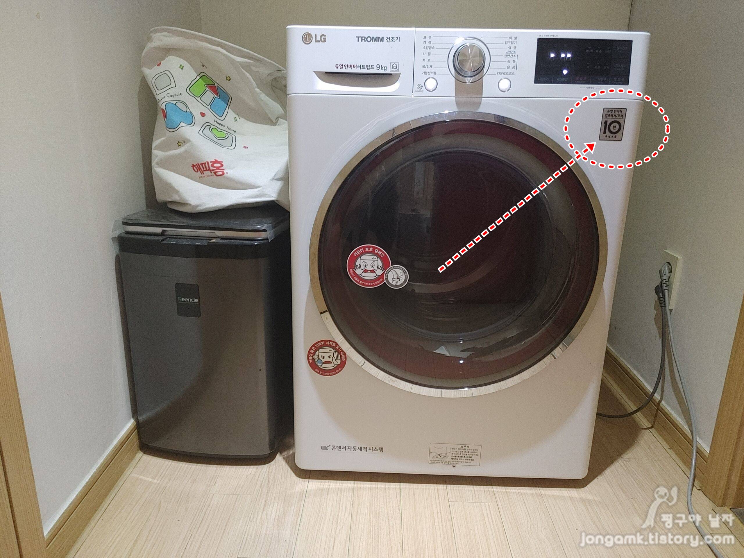 엘지 트롬 의류건조기(RH9WG)의 건조 고장의 원인은 바로 컴프레서였습니다. 듀얼인버터 컴프레서와 모터의 고장은 10년 무상보증이기 때문에 무상 교체로 수리비는 0원이었습니다.