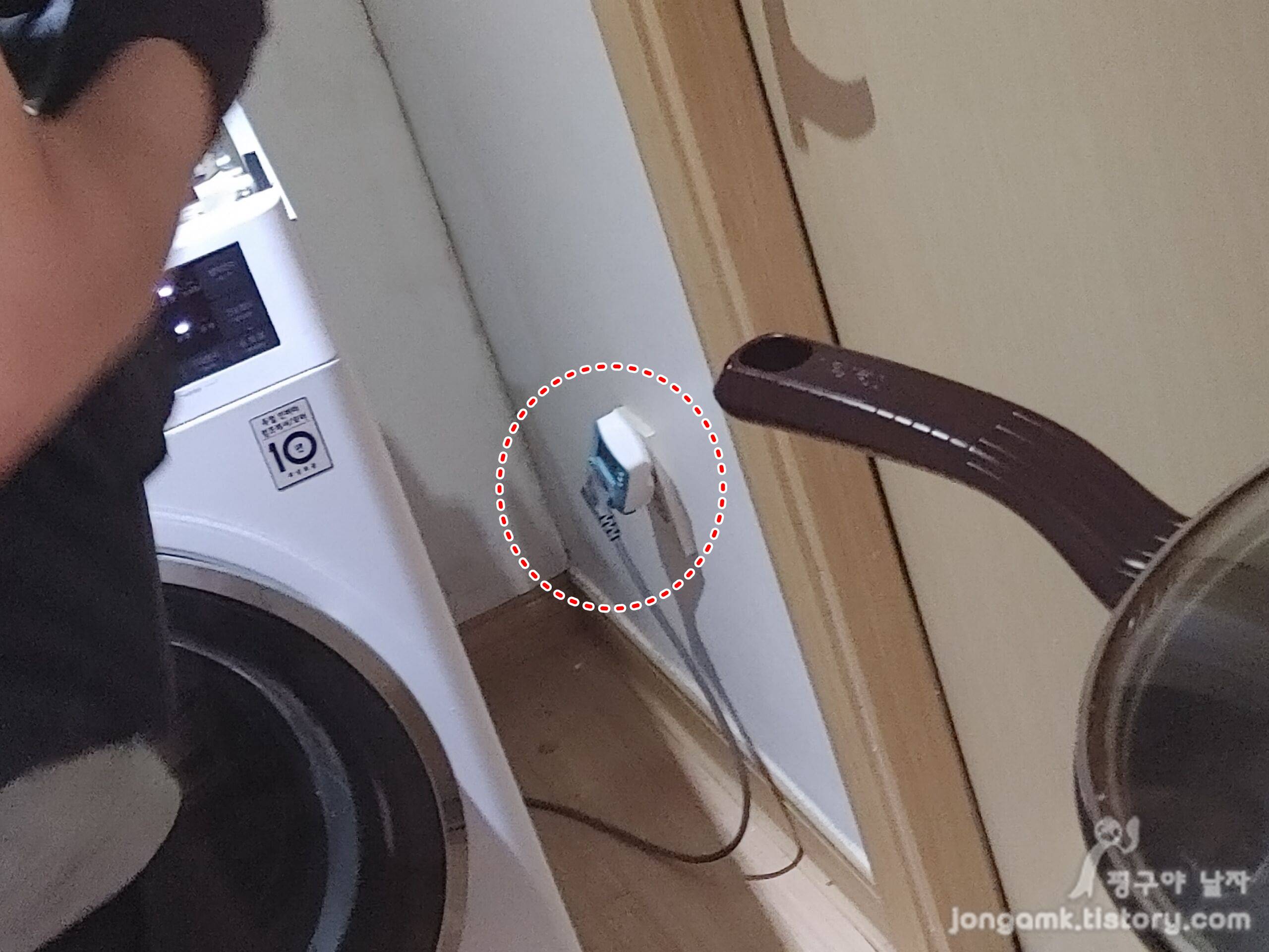 아무래도 소비자 설명도 중요하지만 정확한 원인을 찾는 게 중요하기 때문이겠죠. 일단 전원콘센트에 검사 관련 디바이스를 장착해 확인하고 에러코드를 스마트폰에서 찾으며 엘지 의류건조기 열풍 건조 고장의 원인을 찾기 시작했습니다.