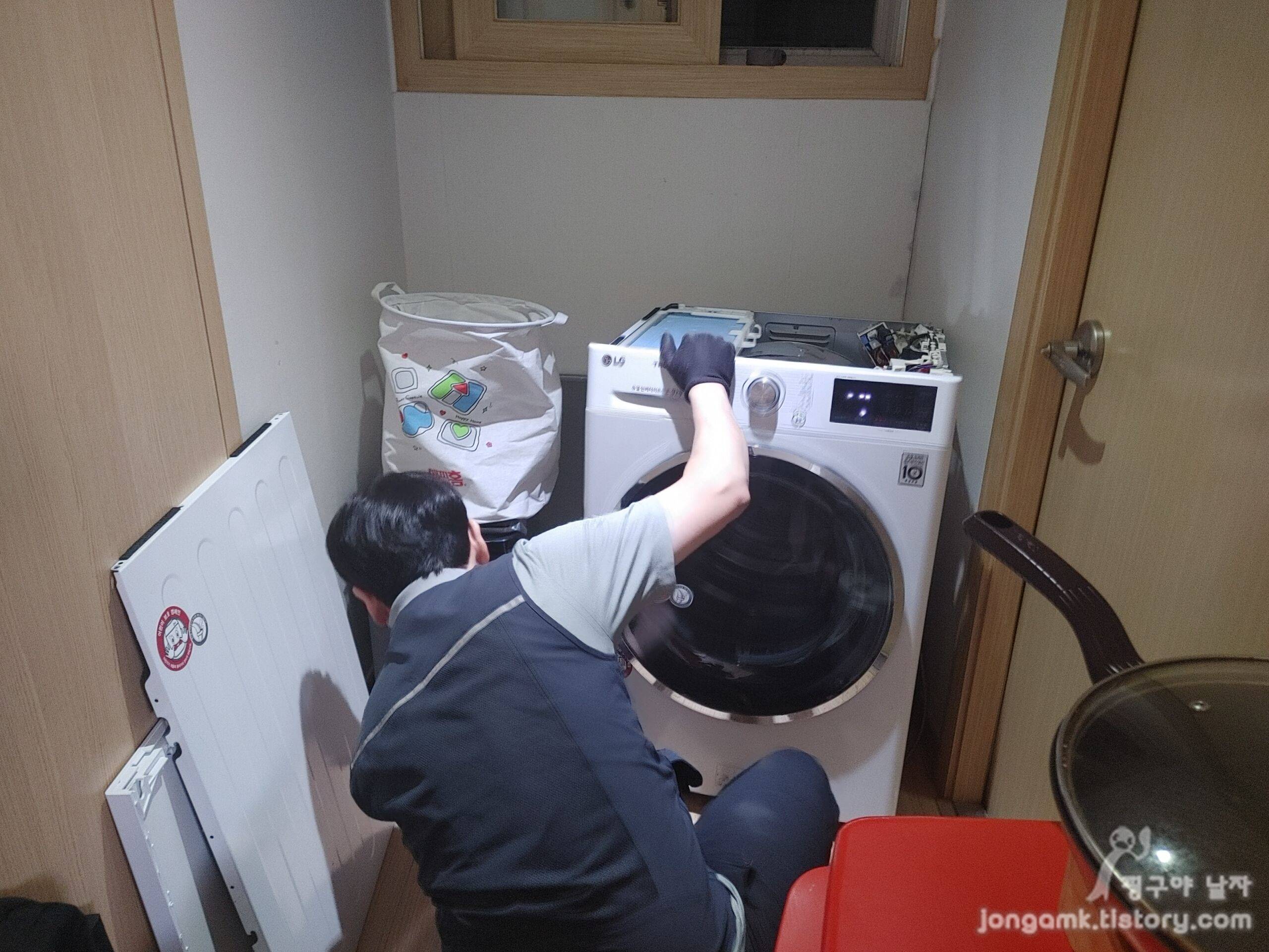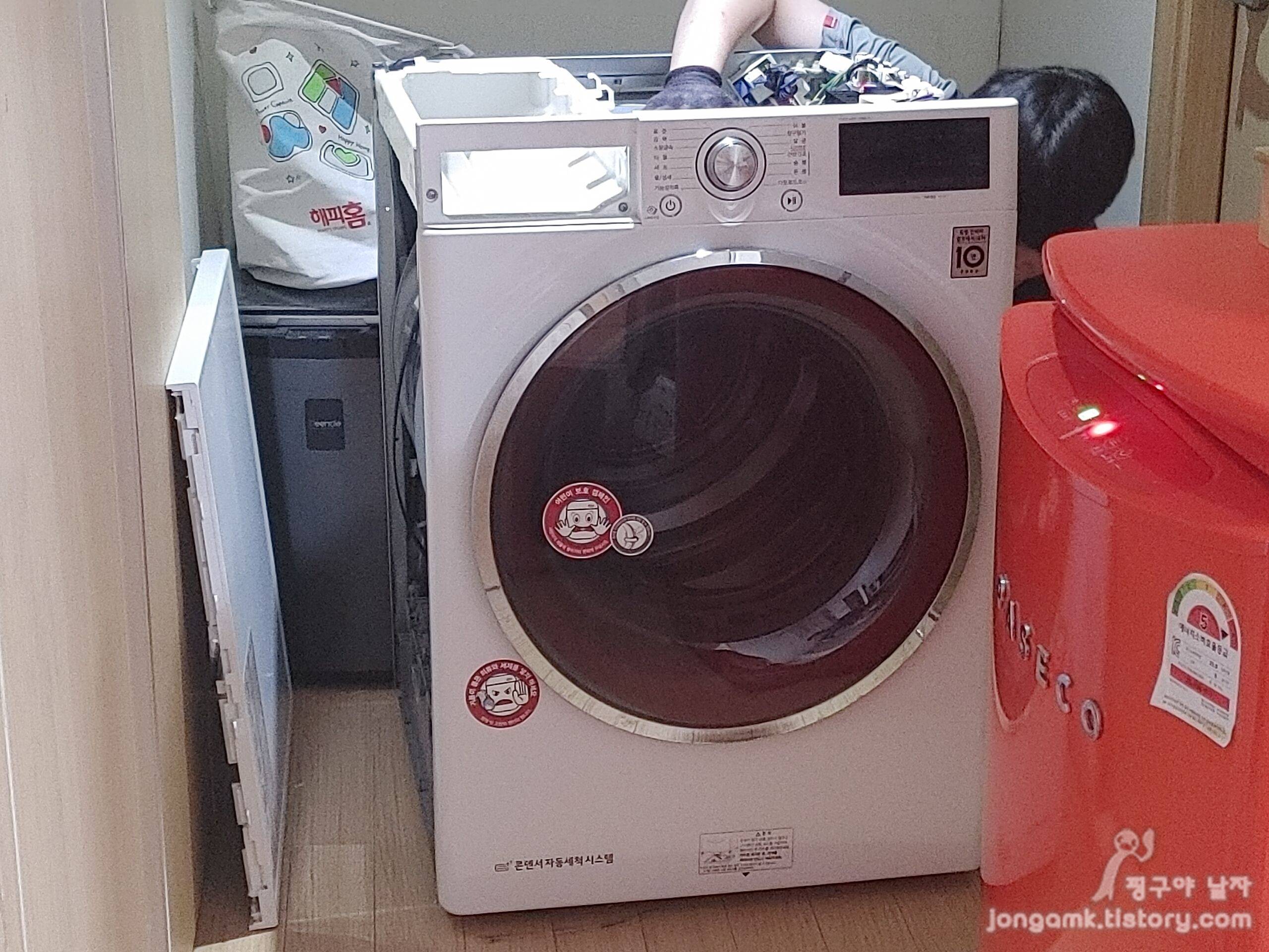 드디어 약속한 날짜에 LG전자 A/S 기사님이 도착했습니다. 이미 A/S 신청 시 의류 건조기 상태를 설명했고 부속품을 준비해 오셔서 금방 수리가 끝날 줄 알았는데 약 1시간 20분 정도 걸린 것 같아요.