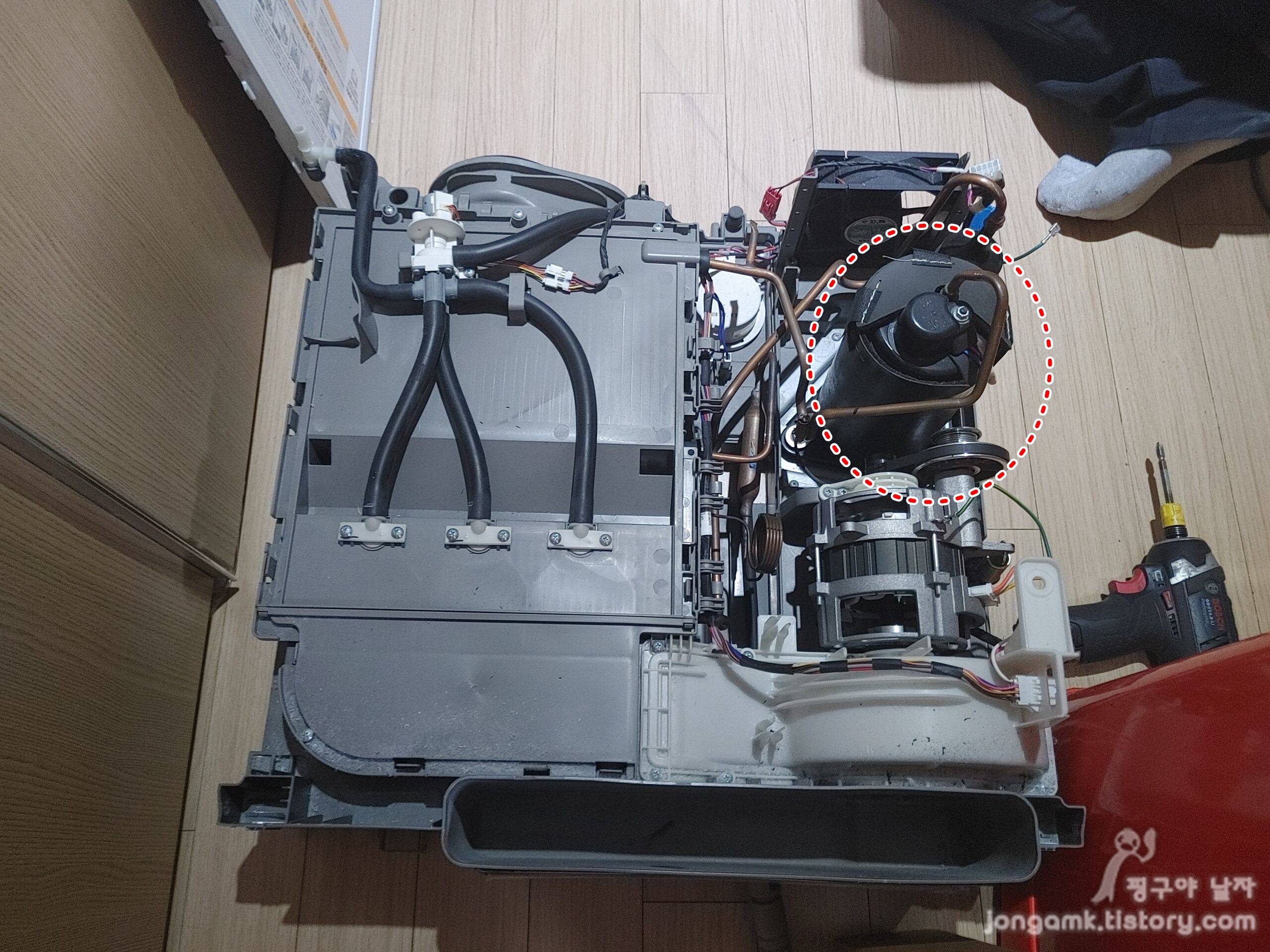 위의 사진에 빨간 동그라미가 바로 10년 무상 보증 대상인 컴프레서입니다. 그리고 바로 아래에 있는 것이 모터입니다. 컴프레서만 교체하면 되는 줄 알았는데 그렇게는 안되고 통째로 교체를 해야 한답니다.