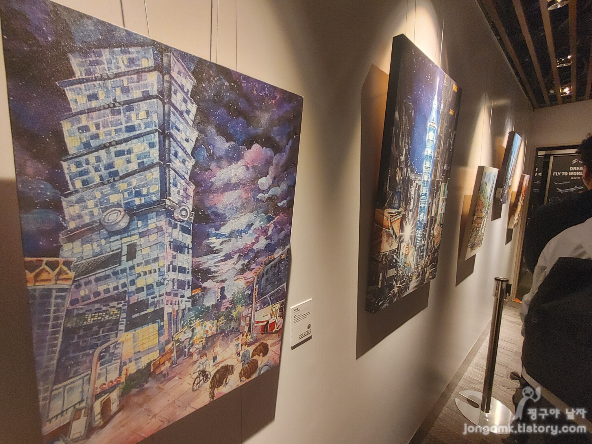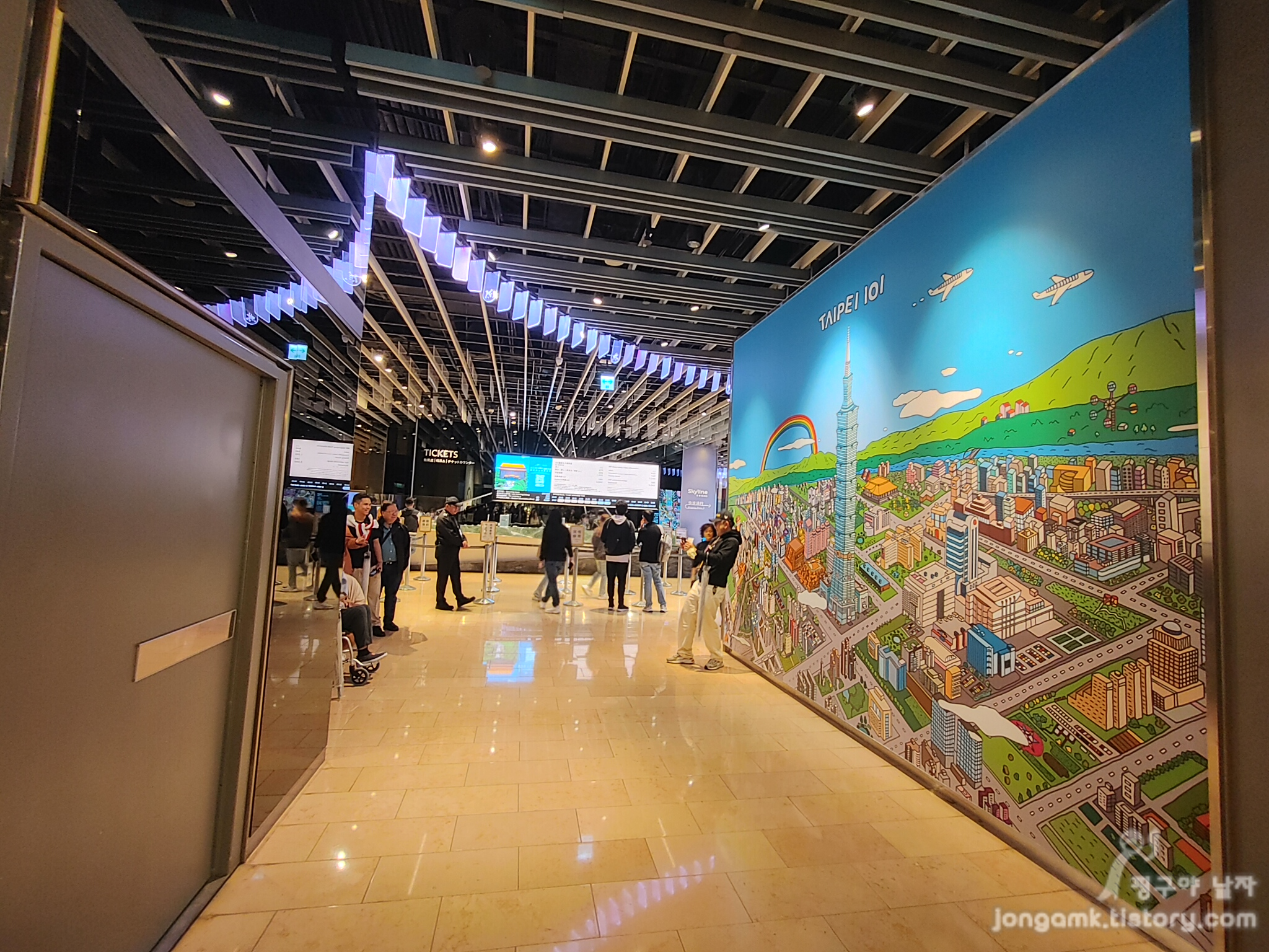 짧지만 대만의 랜드마크 타이페이 101 타워를 내려와야 했습니다 벽면에는 타이페이를 사랑하는 대만 사람들의 그림들이 전시되어 있습니다 89층에서 5층까지 내려가는 데는 올라올 때처럼 37초가 아니라 좀 더 시간이 걸렸어요 그리고 101 타워에 있는 식당에서 맛있는 딤섬으로 하루를 마무리했답니다