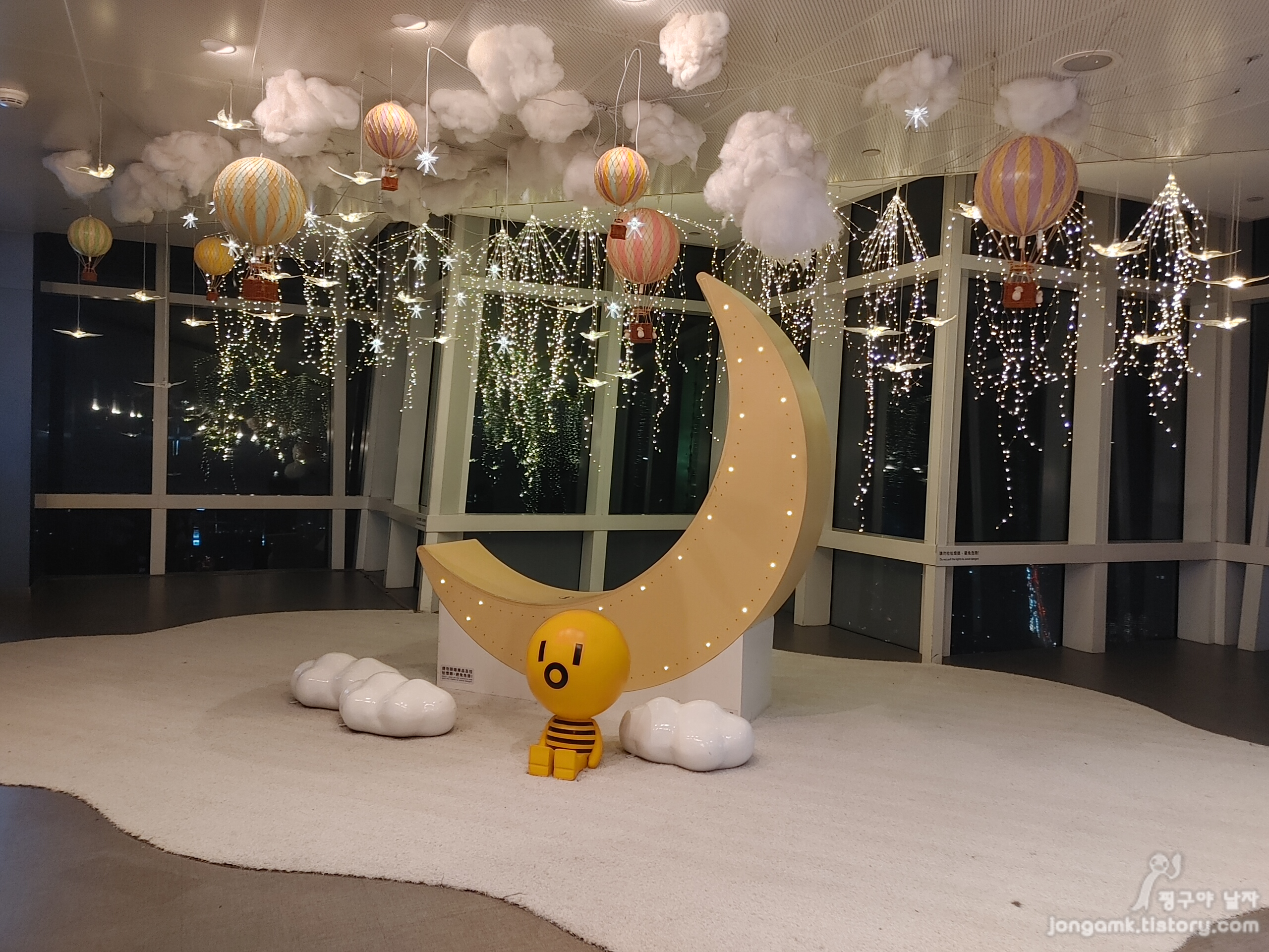 타이페이 101 타워 89층에는 다양하게 기념 사진을 촬영할 수 있도록 여러 가지 기념물과 조형물들이 설치되어 있습니다 늦은 저녁이고 비가 와서 그런지 야경은 선명하게 볼 수 없어 아쉬웠습니다