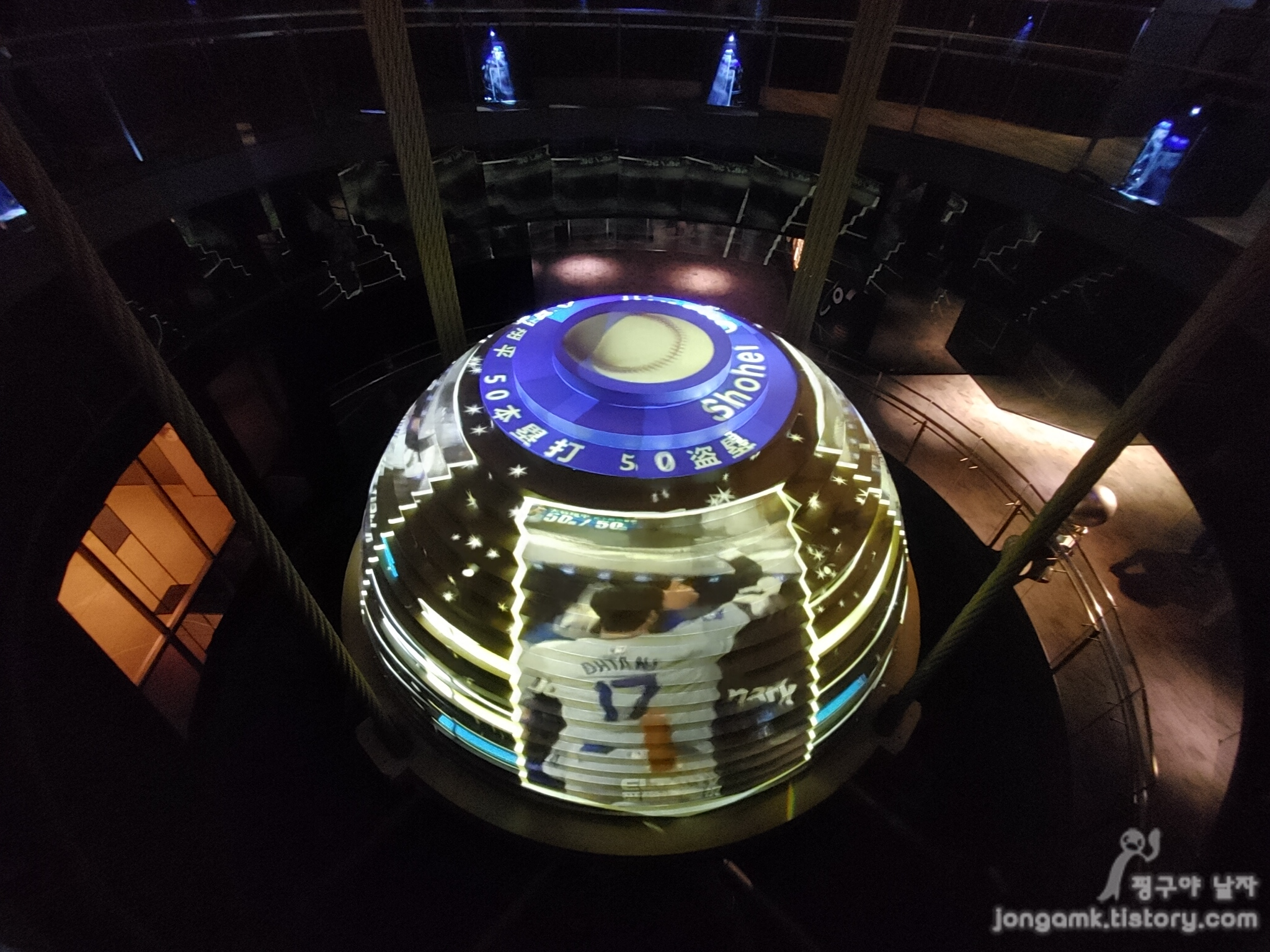 6톤 가량의 대형 원형 추가 큰 줄에 매달려서 빌딩 한가운데 설치되어 있고 방문하는 관광객들에게 구경할 수 있도록 해 주었습니다 그리고 원형 주에는 오타니 쇼웨이의 야구하는 모습을 볼 수 있었습니다