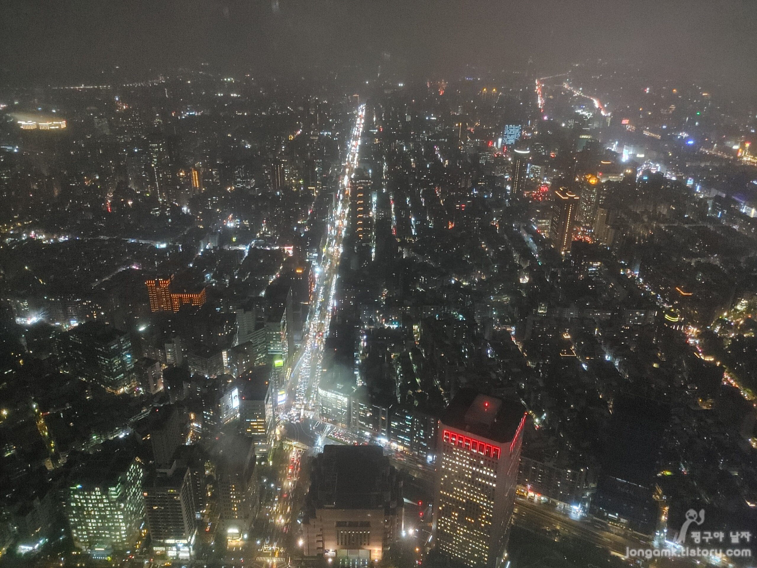 대만의 랜드마크 타이페이 101 타워에서 내려다 본 시내 야경입니다 낮에 봐도 멋있을 것 같고 비가 오고 안개가 껴서 선명하진 않지만 장관이었습니다