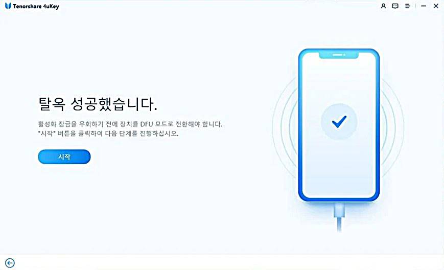약간의 인내심을 갖고 기다리면 위와 같이 탈옥 성공했습니다.라는 성공 메세지로 아이클라우드 활성화 잠금해제가 마무리되었음을 알 수 있습니다. 그리고 시작 버튼을 누릅니다.