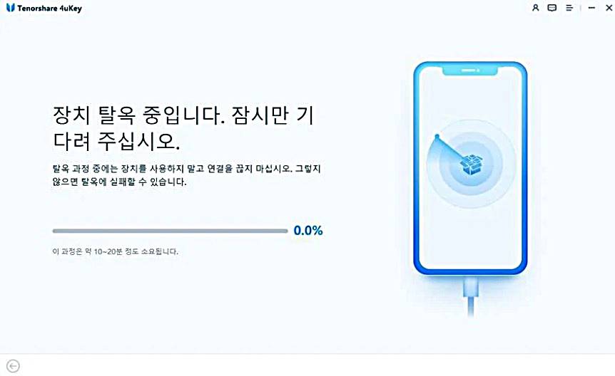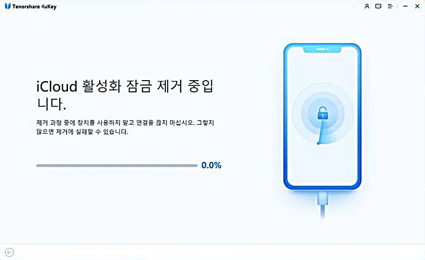 5 단계에서 테너쉐어의 포유키(Tenorshare 4uKey for iOS)가 자동으로 아이클라우드(iCloud) 활성화 잠금을 제거하기 시작합니다. 잠시만 기다리면 중고 아이폰 판매자의 가물가물한 기억으로 인한 스트레스를 날릴 수 있습니다.