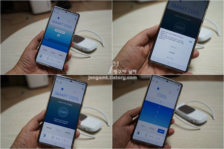 특히 더위를 많이 타는 분들은 SMART를 눌러 MANUAL를 선택해 차가운 정도를 직접 선택해 사용할 수도 있습니다. 주로 처음에는 레벨5로 사용하다가 어느 정도 더위가 식으면 SMART로 세팅해 사용하고 있습니다. 레온 포켓 프로를 사용 후 벗을 때는 넥밴드를 잡고 분리해야 합니다. 통풍구를 잡고 꺼내면 무게가 있다 보니 분리가 되어 옷 속으로 들어가는 거 있죠. 이 부분은 소니가 개선해야 할 것 같아요.