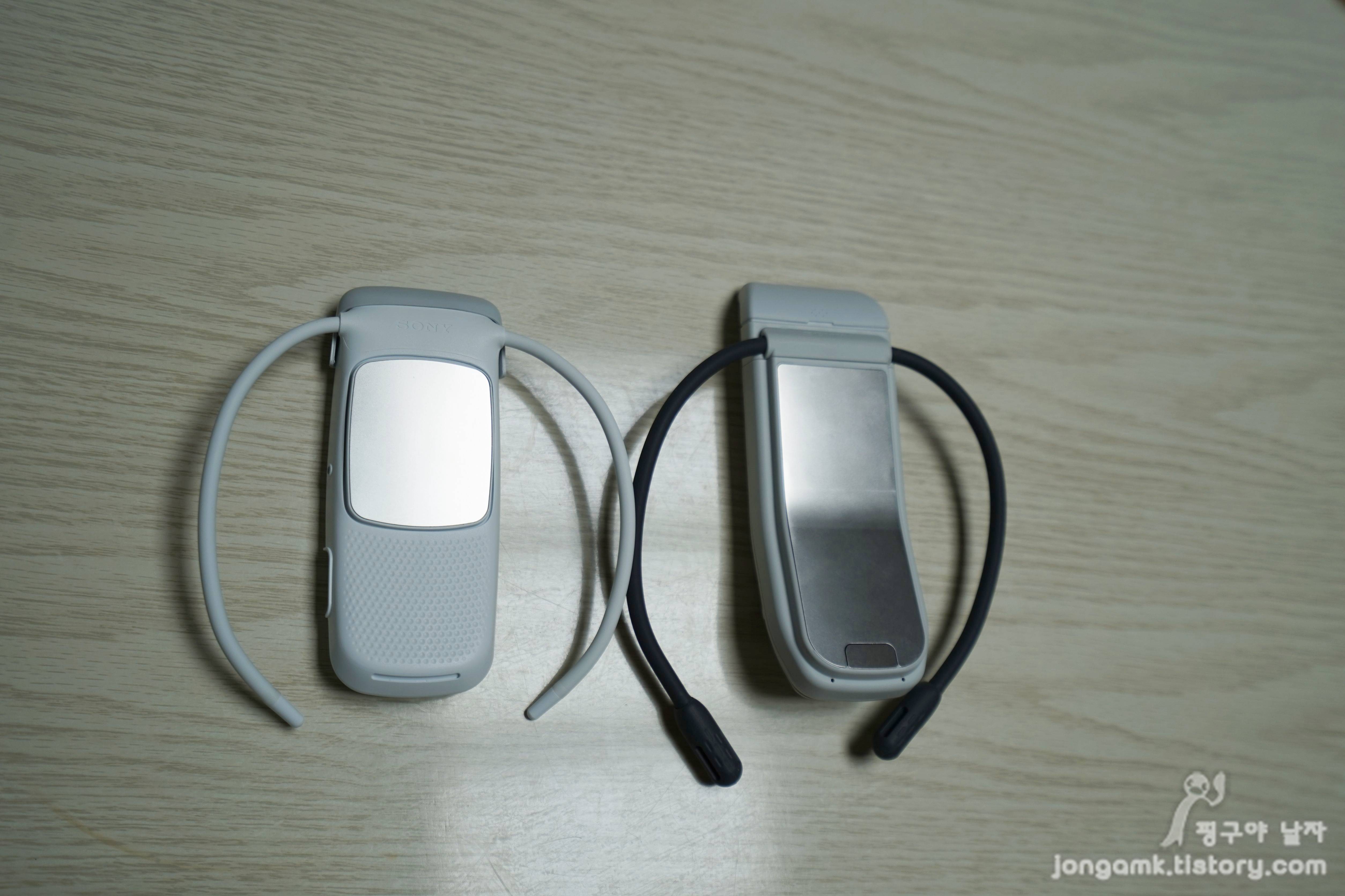 레온 포켓5와 레온 포켓 프로의 크기와 모양을 비교해 보면 크기나 두께의 차이 그리고 통풍구가 확실히 차이가 납니다. 성능의 차이가 있기 때문에 야외 활용 여부에 따라서 선택해 사용하면 되지 않을까 싶습니다. 아무래도 레온 포켓 프로는 무게감이 있어 넥밴드도 차이가 있습니다.