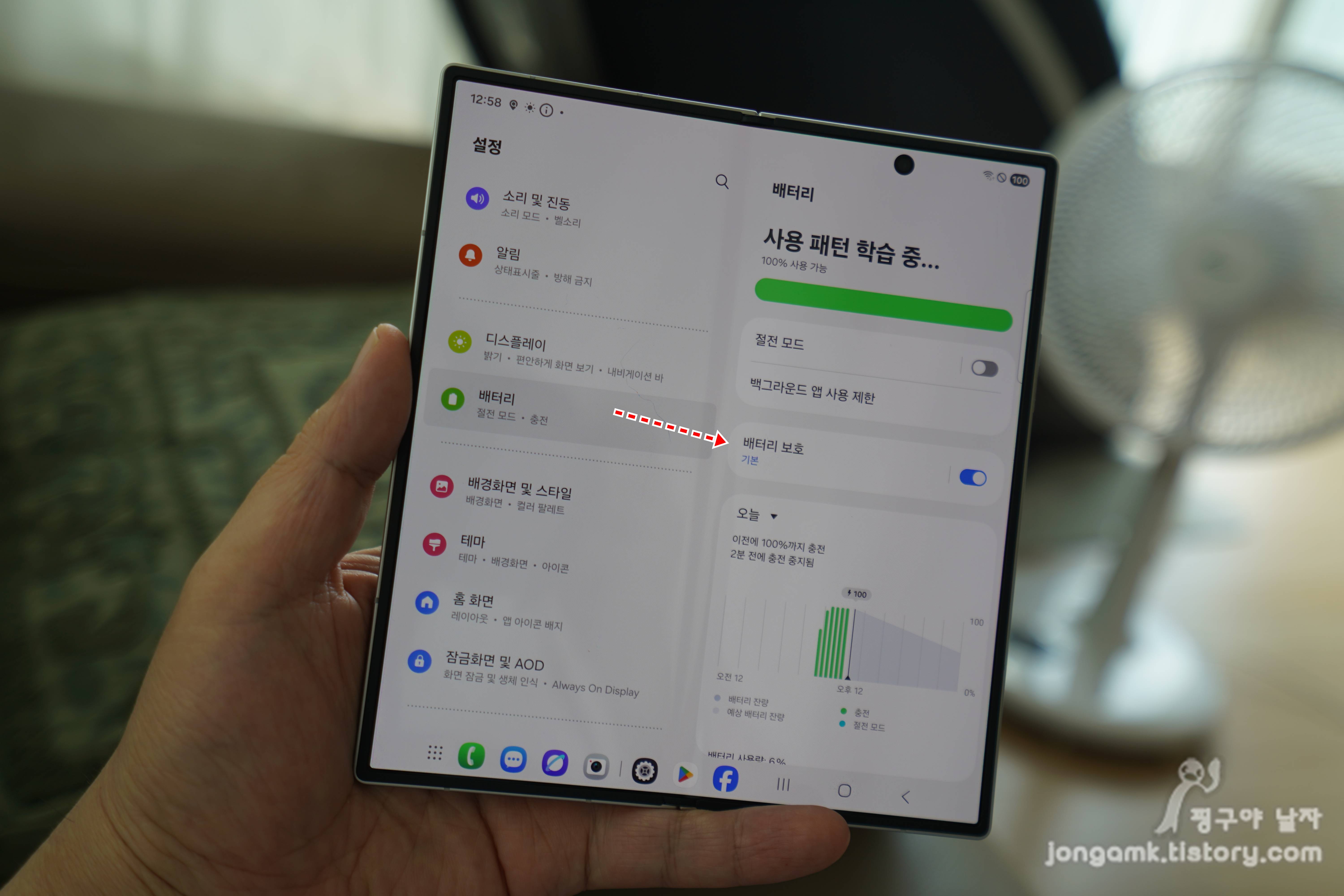 다음은 소중한 배터리입니다. 갤럭시Z 폴드7 뿐만 아니라 모든 스마트폰이 마찬가지겠지만 배터리는 소모품입니다. 그래서 충전시 과부하로 인해 수명을 단축하면 안 되겠죠. 주간에서 육안으로 충전여부를 판단하서 95% 이상 충전되면 멈출 수 있는데 취침 전에 충전하면 완충이 되어도 계속 충전 중 일 수 있겠죠.