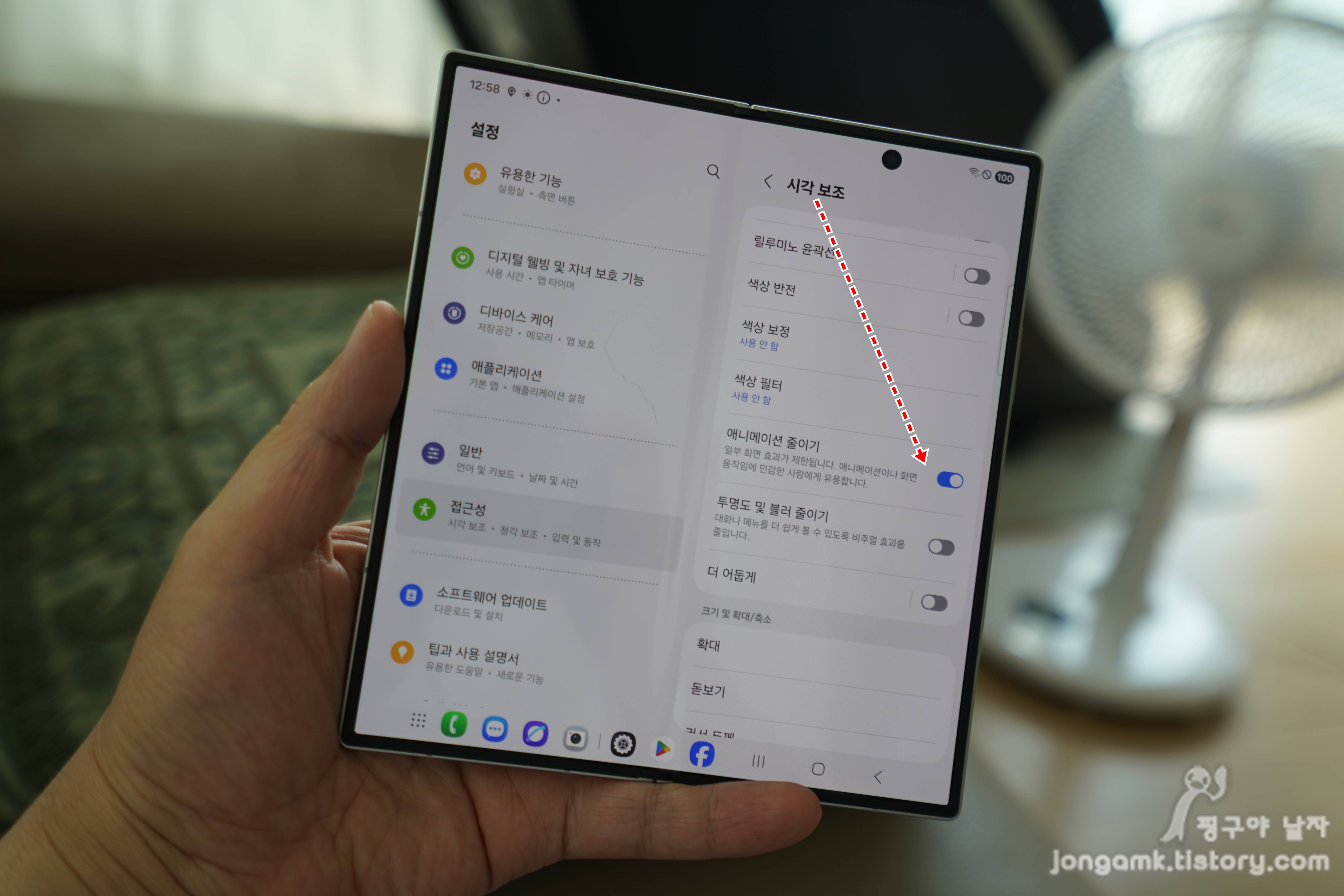 그럼 우측의 메뉴 중에 애니메이션 줄이기 옵션이 있는데 이를 활성화시키면 화면 넘어가는 속도가 훨씬 빨라집니다. 비활성화되어 있으면 화면이 좀 더 부드럽게 넘어가는 대신 속도가 상대적으로 느립니다.