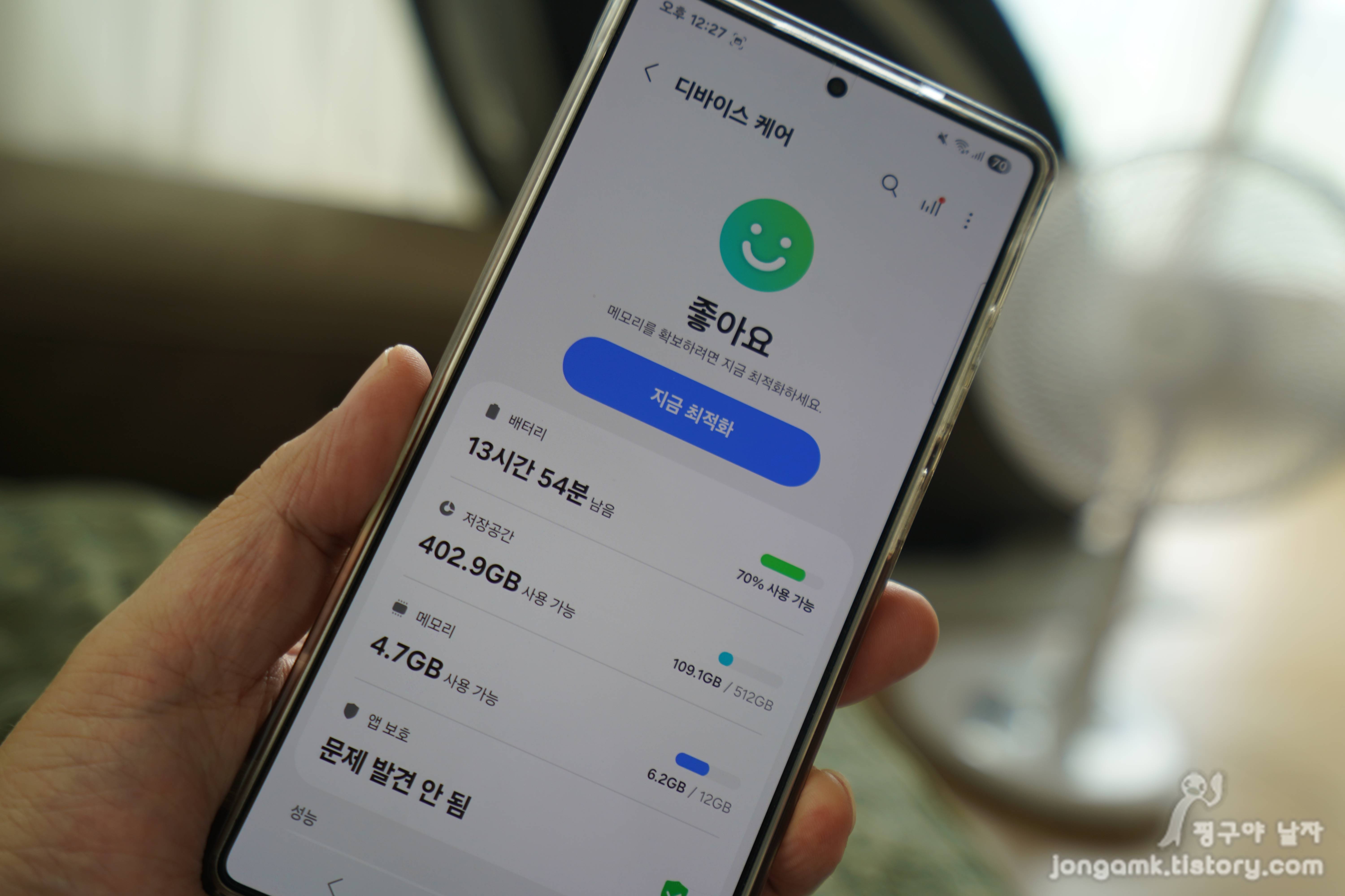 저장공간 내에 중복파일이나 용량이 큰 파일 그리고 시용하지 않은 앱은 일정하게 정리해 준다면 쾌적한 저장공간이 확보되지 않을까 싶습니다. 갤럭시Z 폴드를 켤 때 저장공간도 속도에 영향을 미치기도 하니까요.