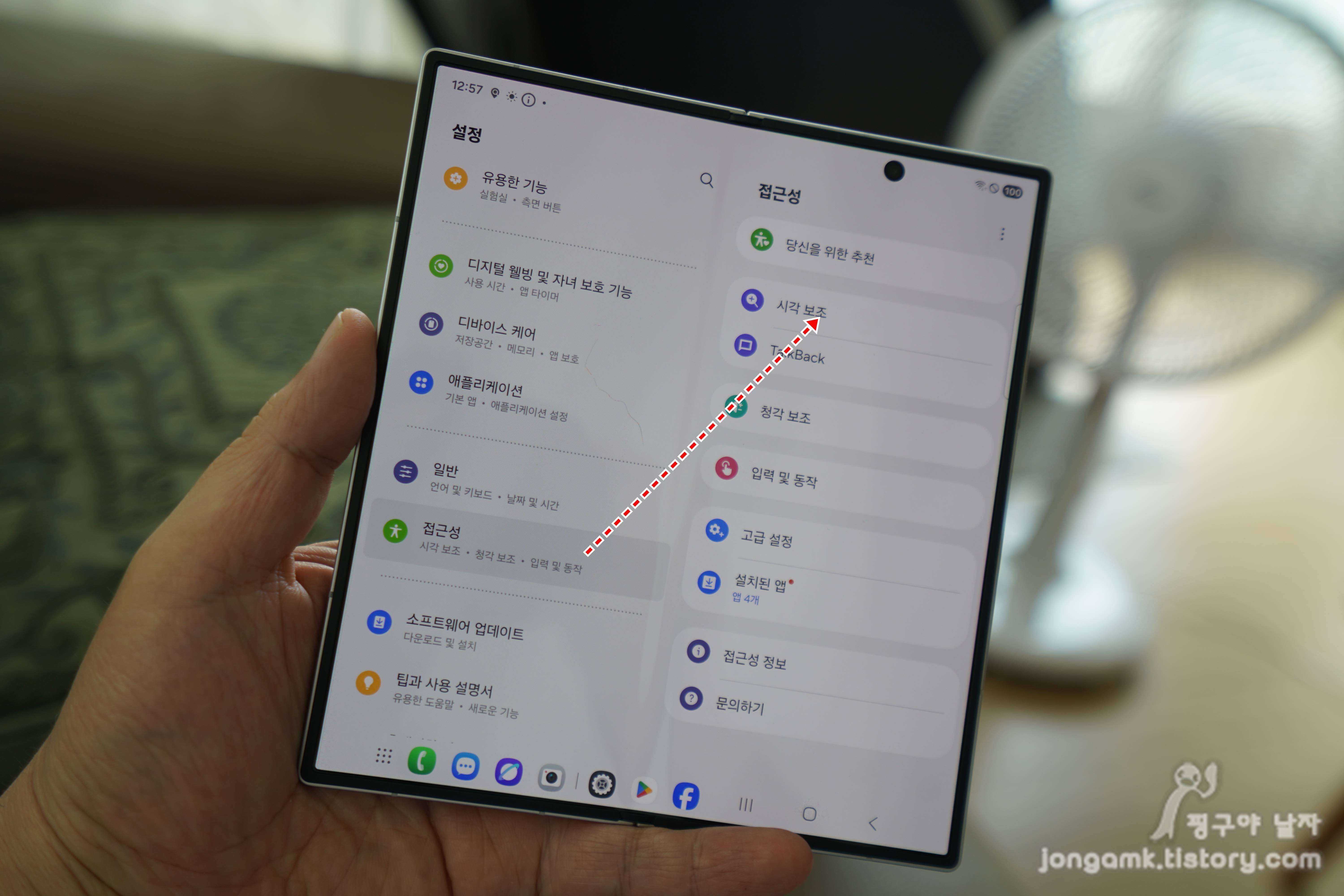 화면에서 보는 각종 콘텐츠가 여러가지 이유로 보이는 속도가 느려질 수도 있는데 일단 피부에 와닿게 빠르게 할 수 있는 방법이 있습니다. 설정에서 접근성을 선택합니다. 그리고 우측의 메뉴 중 시각보호를 누릅니다.