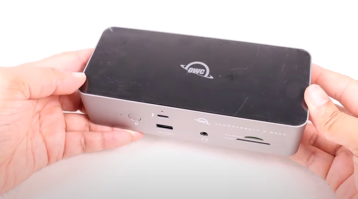 OWC에서는 모니터를 연결하는 방법을 사용자가 결정할 수 있어 USB-C 대 DisplayPort 또는 HDMI 어댑터를 구매해야 할 수도 있지만, USB-C/썬더볼트를 통해 연결하면 효율적인 포트 사용이 되겠죠. 전면에는 고속 카드 리더기 두 개, 10Gbps USB-A 포트, 오디오 잭, 그리고 전원 버튼이 있습니다. 최근 개선된 기능으로 microSD 슬롯에 돌출부가 추가되어 도크에서 카드를 더 쉽게 꺼낼 수 있습니다.
