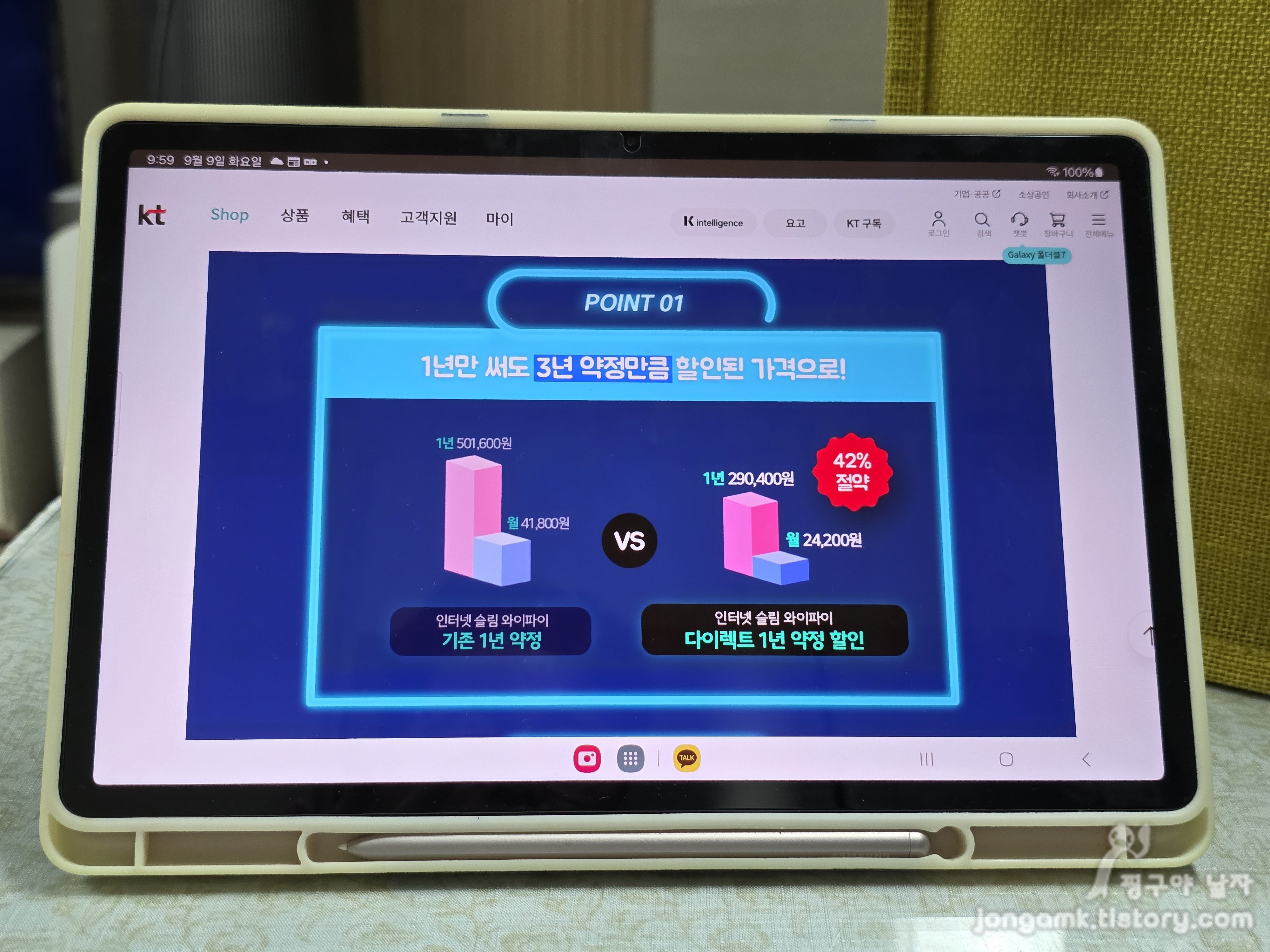 원룸 인터넷, 오피스텔 인터넷, 소상공인 인터넷 등 단기로 사용해야 하지만 바쁜 일상이다 보니 현관 입구에 있는 인터넷 가입 광고에 생각보다 비싸게 가입할 수도 있습니다. KT공식 온라인몰인 KT닷컴에서 KT닷컴 다이렉트 1년 약정 할인을 받아 원하는 날짜와 시간에 간편한 가입 및 당일 설치하면 어떨까 싶네요.(자세히보기)