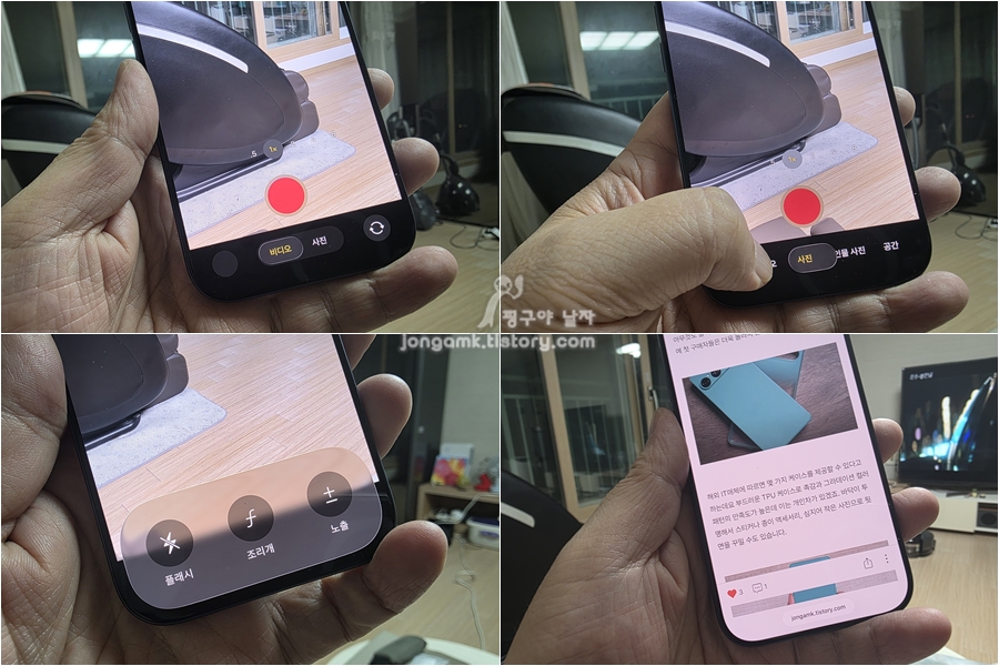 아이폰17 프로를 쌩폰으로 사용하면 책상 위에 놓았을 때 흔들거림이 줄었지만 여전했어요. 그러나 기울기 덕분에 바닥에 내려놓고 화면을 볼 때는 미미하지만 약간 더 시야각이 확보되는 것은 있습니다.
