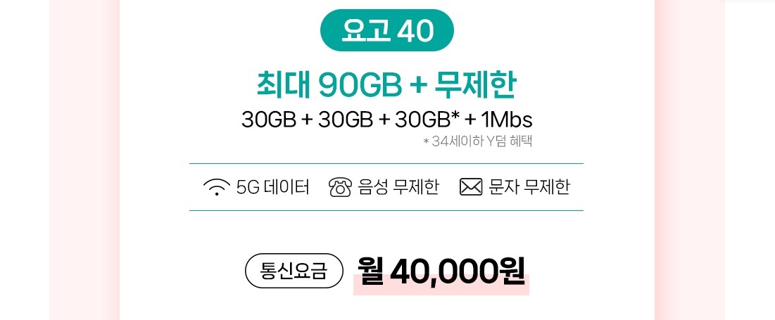 KT닷컴이 기간 한정(~10.31)으로 5G 무제한 무약정 요금제를 선보였습니다. 요금제는 요고40입니다. 데이터는 기본으로 30GB가 기본으로 제공되고 추가로 30GB를 제공받을 수 있어요. 그런데 34세 이하의 경우는 여기에 추가로 30GB를 제공해 총 90GB를 매월 사용하게 됩니다.