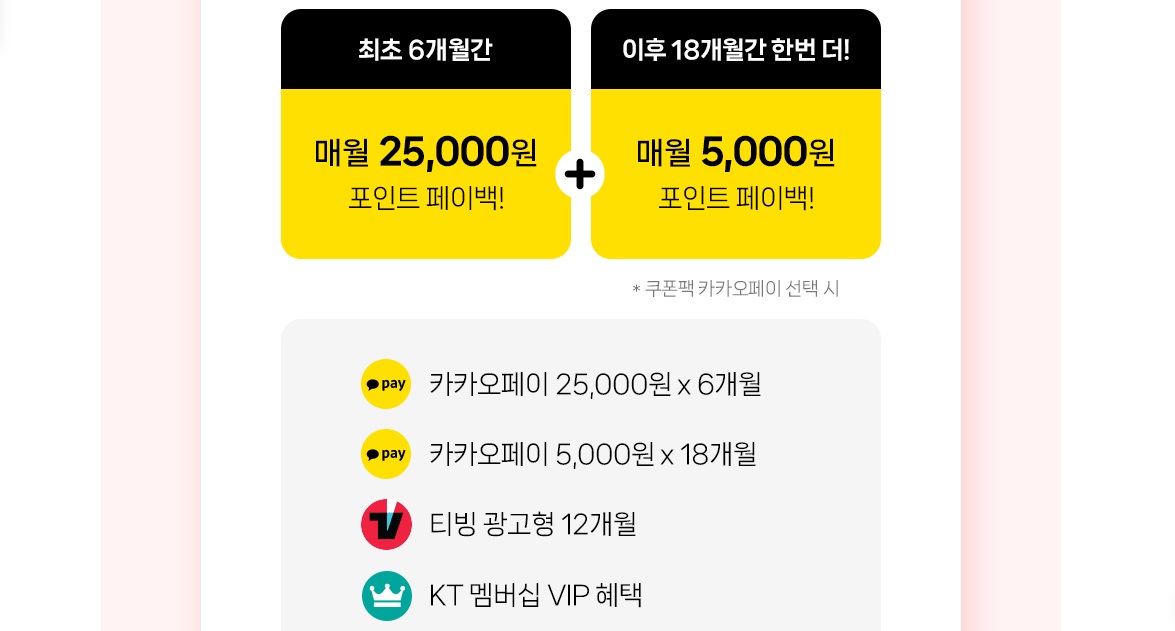 그런데 월 요금이 40,000원이라니 놀랍죠. 일반 요금제와 비교가 될 정도로 괜찮은 거 같아요. 쿠폰팩 카카오를 선택하면 매월 25,000P 페이백도 제공받을 수 있으니 처음에는 알뜰폰 요금제인 줄 알았답니다. 그리고 추가혜택으로 VIP 등급과 유무선 결합과 무선끼리 결합 시 인터넷 요금을 월 5,000원 할인도 받을 수 있답니다.