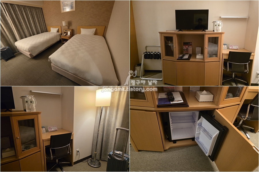 트윈침대로 편하게 쉴 수 있었구요. 생수는 2병 제공되었습니다. 일본은 욕실의 물을 마셔도 된다고 하지만 내키지 않는 거 있죠. 테이블이 별도로 없이 아늑한 규모의 호텔이지만 피로를 풀기에는 충분했습니다.
