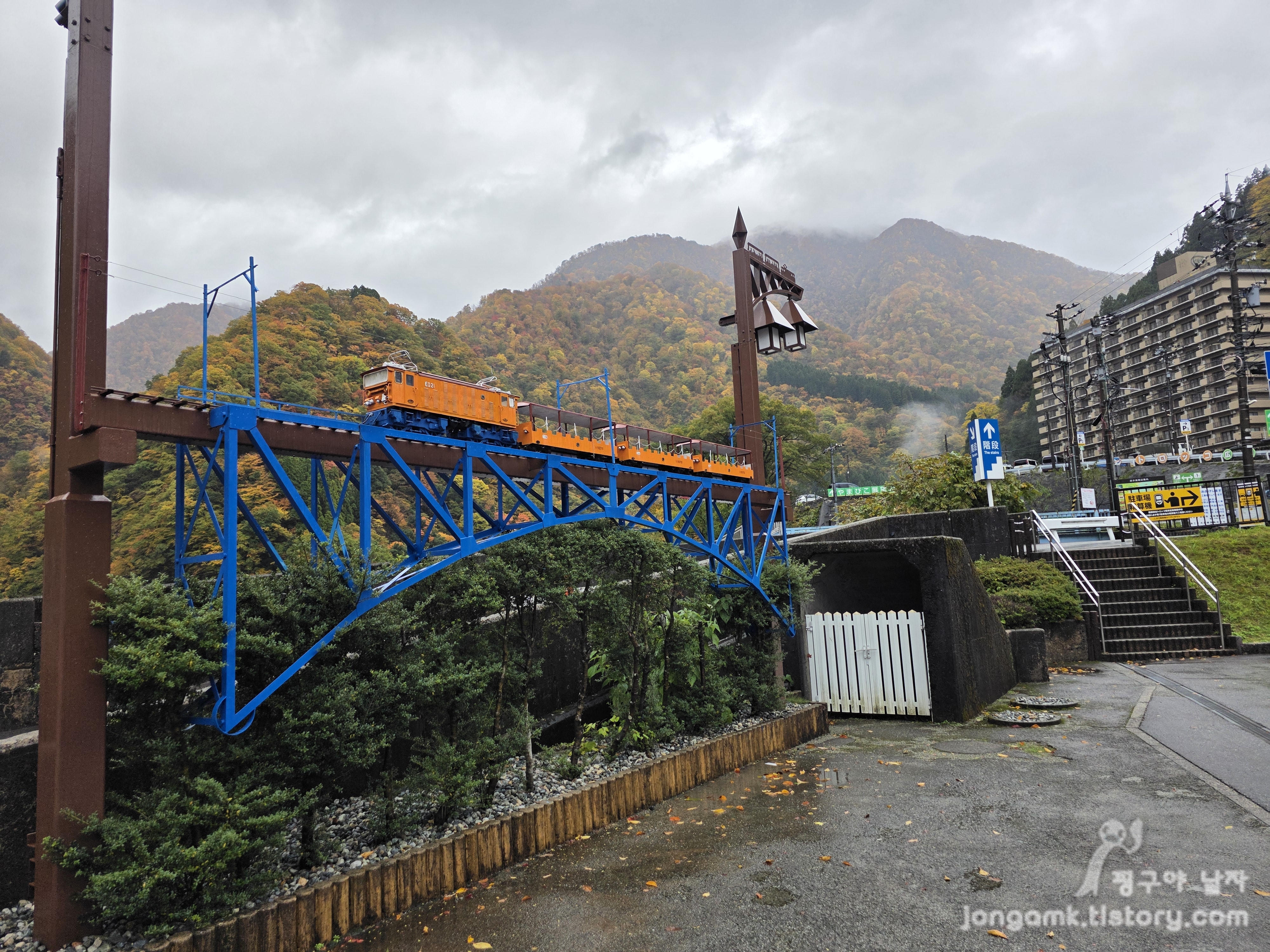 우나즈키로 약 2시간 정도 이동해 도착한 곳은 일본 알프스 낭만 열차여행으로 알려진 쿠로베 토롯코 열차를 타러 왔습니다. 쿠로베 협곡을 감상할 수 있는 약 50분 정도의 코스는 정말 잊을 수가 없네요. 토롯코 열차는 알펜루트의 고지대에 위치하며 쿠로베 댐 건설에 사용된 철도를 관광 상품으로 활용했다고 합니다.