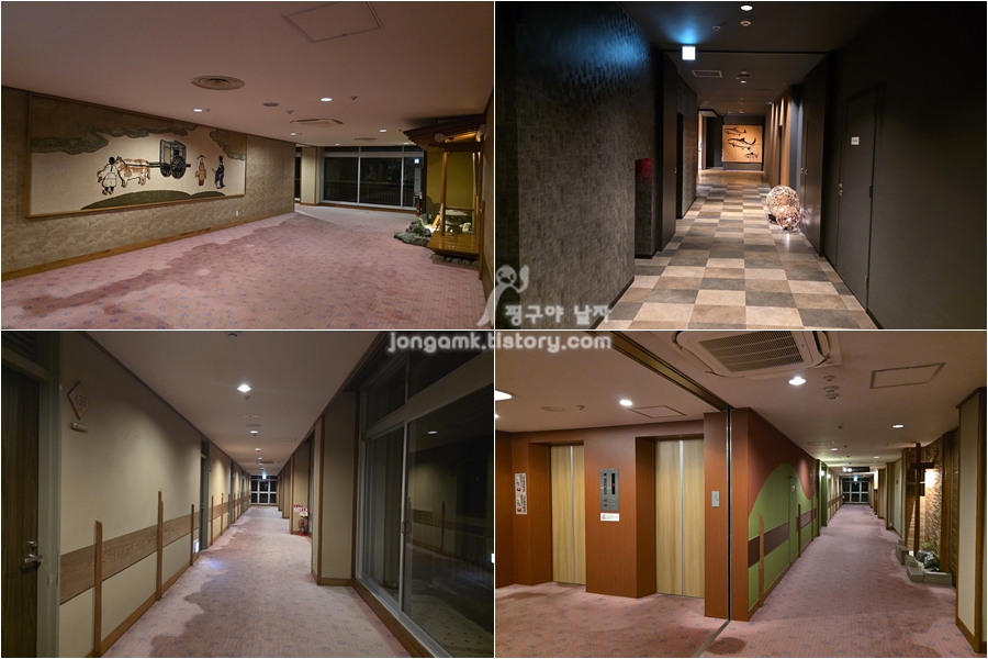각 숙소별로 분위기가 약간식 다르고 레스토랑으로 가는 복도는 깔끔한데 숙소에는 물 얼룩이 카페트를 차지해 보기는 않좋았는데요. 그렇다고 축축한 게 아입니다. 전체적으로는 구마모트에 있는 히젠야 호텔과 비슷한 분위기였습니다.
