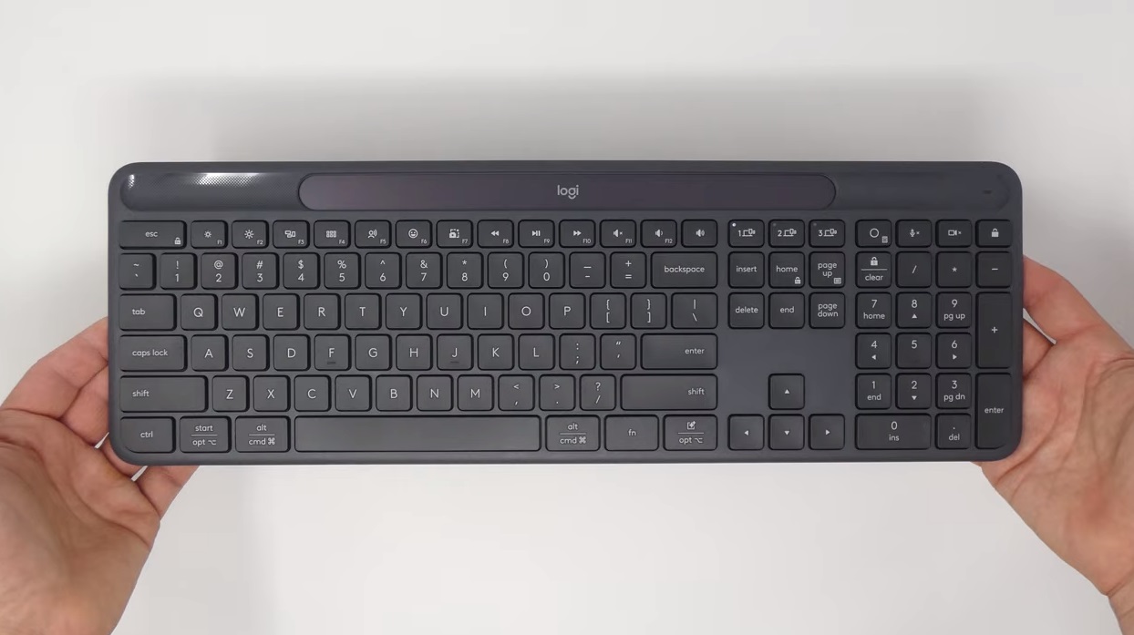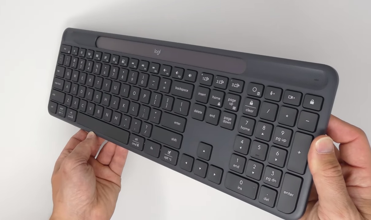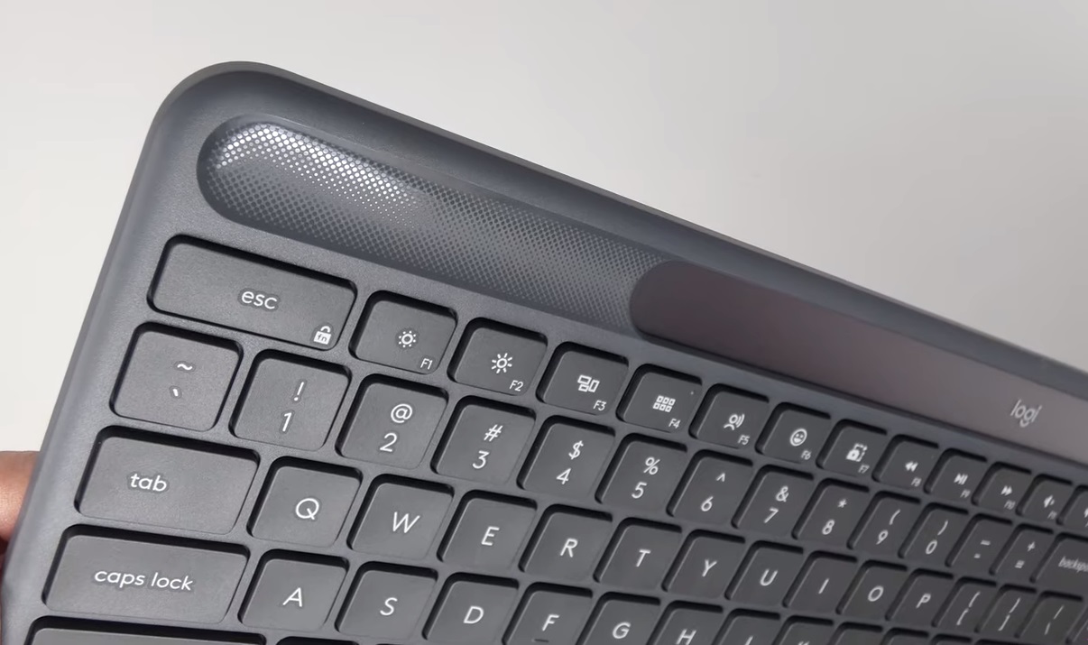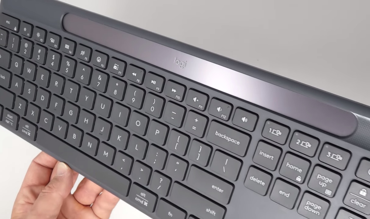 키는 흔들림이 없고 본체는 압력을 받아도 휘어지지 않습니다. 로지텍은 그래파이트 버전을 70% 재활용 플라스틱으로 제작했다고 합니다. 덕분에 은은한 무광택 마감에 약간 거친 질감이 더해져 지문이 잘 묻지 않습니다. 키 자체에도 동일한 미끄럼 방지 표면 처리가 되어 있어 장시간 타이핑 시에도 손가락에 편안한 느낌을 줍니다. K980도 사용 시간에 따라 손가락의 유분 때문에 광택이 생길 수 있습니다.