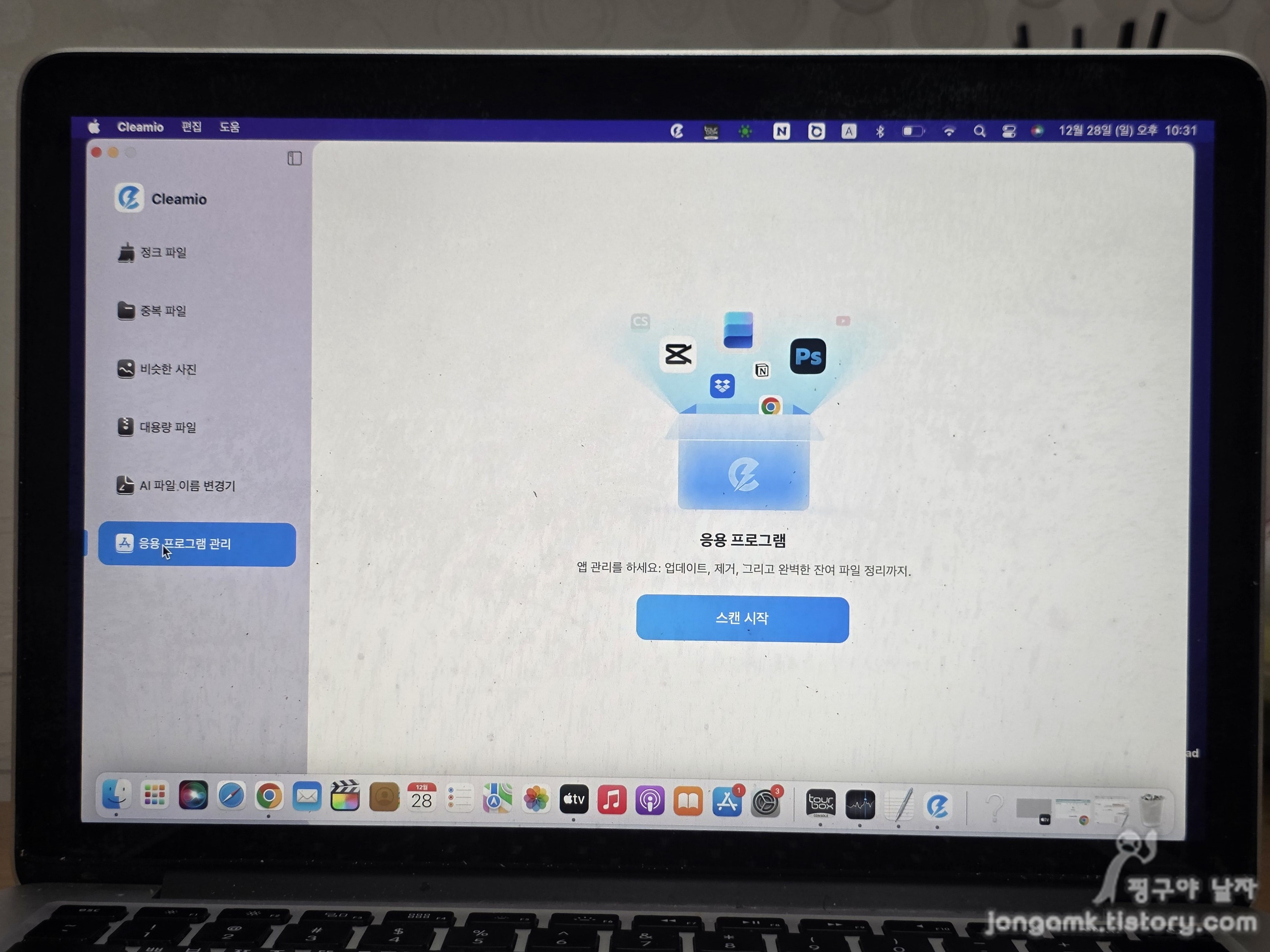 다양한 기능 중에 앱을 설치하고 삭제를 했는데 여잔히 남아있는 앱들을 정리하는 것을 가장 먼저 사용해 보았습니다. 나머지 기능들도 사용이 간단해서 잔여파일를 정리하는 과정을 보면 어렵지 않다고 느끼게 될 것입니다. 먼저 좌축 하단에 있는 응용프로그램 관리를 선택하고 스캔시작을 눌렀습니다.