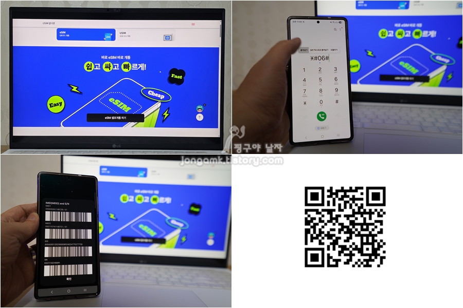 두 번째는 eSIM 개통으로 개인적으로 더 추천하고 싶은 방법으로 물리적인 심카드가 필요 없는 eSIM은 더욱 편리하고 빠릅니다. 갤럭시S26처럼 eSIM을 지원하는 기기라면 배송을 기다릴 필요 없이 5분 만에 개통이 가능하죠. 스마트폰의 고유번호(EID/IMEI)를 확인하고 요금제를 선택한 후 QR코드를 스캔하면 됩니다. 그리고 eSIM을 활성화하면 됩니다. 싸고, 쉽고, 빠르다는 수식어가 딱 어울리는 개통방식입니다.