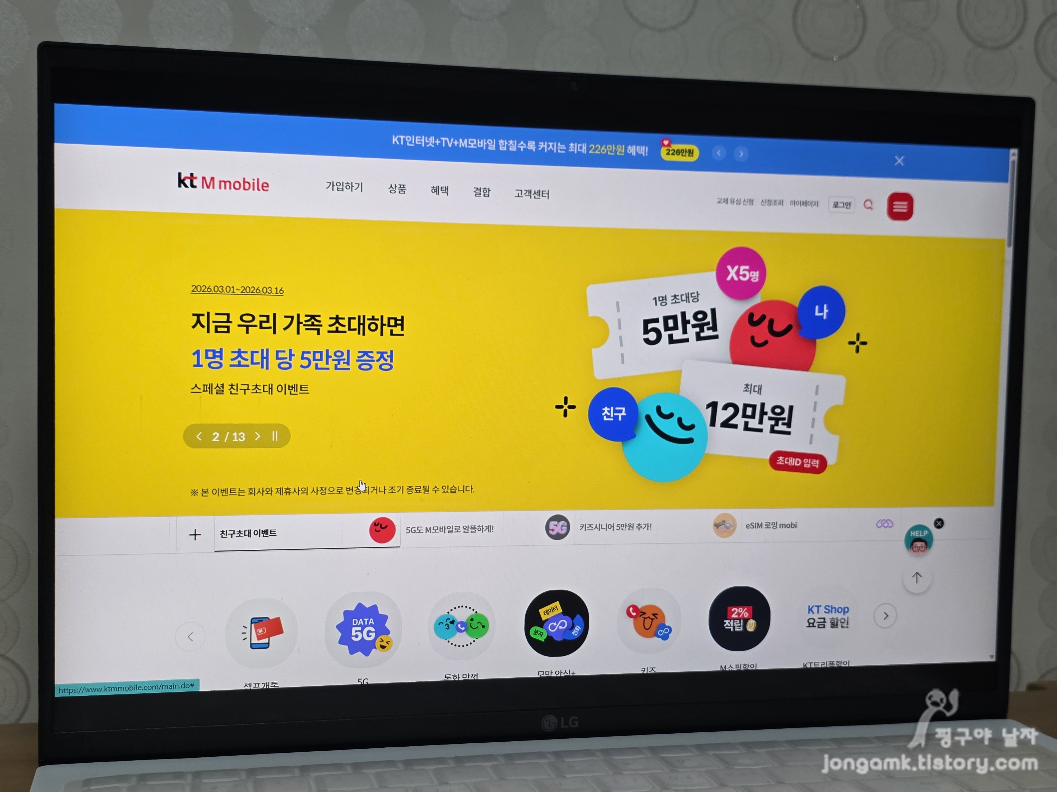 위에서도 언급을 했듯이 kt M모바일은 매월 다양하고 풍성한 프로모션을 진행하고 있어 기본적인 통신비 절감 이외에도 다양한 혜택을 누릴 수 있습니다. 특히 3월 프로모션이 역대급입니다. 가입 시 이벤트 코드 입력란에 'M' 만 입력하면 5G의 어떤 요금제든 관계없이 12만원 혜택을 100% 증정합니다. 와우 대박이죠. 또한 추천인 혜택으로 6만원에서 최대 12만원, 갤럭시S26 자급제 개통 시 추첨을 통해 네이버페이 3만원까지 드리고 있으니 이번 기회를 놓칠 수 없겠죠. 반드시 최신 기종이 아닌 갤럭시 S23부터 해당된다고 하니 아마도 대부분의 갤럭시 사용자 분들이 해당되지 않을까 싶습니다.