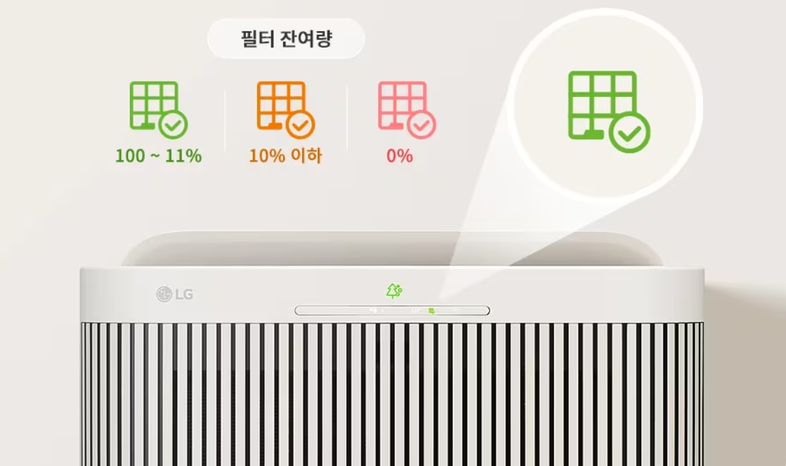 단, 정품 필터를 사용해야 월핏이 보장하는 탈취 및 집진 성능을 온전하게 경험할 수 있다고 합니다. 필터 수명 및 정품 여부는 LG 씽큐(ThinQ) 앱을 통해 손쉽게 확인 가능합니다. 또한, 월핏은 오염도에 맞춰 실시간으로 운전모드와 팬의 작동을 제어하는 AI 모드를 사용할 수 있는 AI 공기청정기입니다.