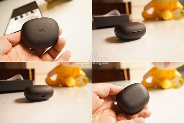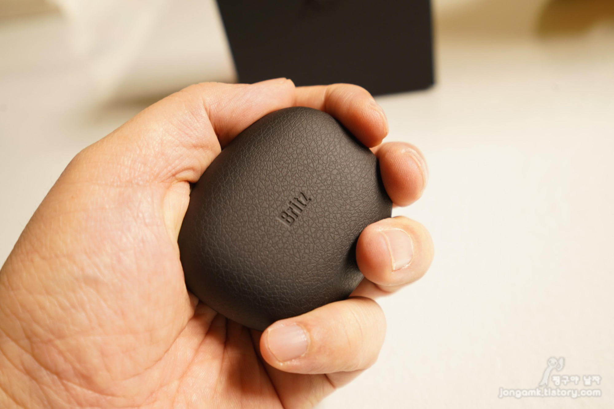 최신 스테레오 블루투스 이어폰 브리츠 어쿠스틱AN3(AcousticAN3) 블랙의 충전케이스입니다. 무광의 케이스에 가죽의 느낌을 살린 표면처리로 미끄럽지 않고 그립감을 좀 더 높여 주었습니다. 충전 케이스는 버튼을 눌러 여는 것이 아니라 사용자에 따라서는 불편하다고 생각할 수도 있을 듯 합니다.