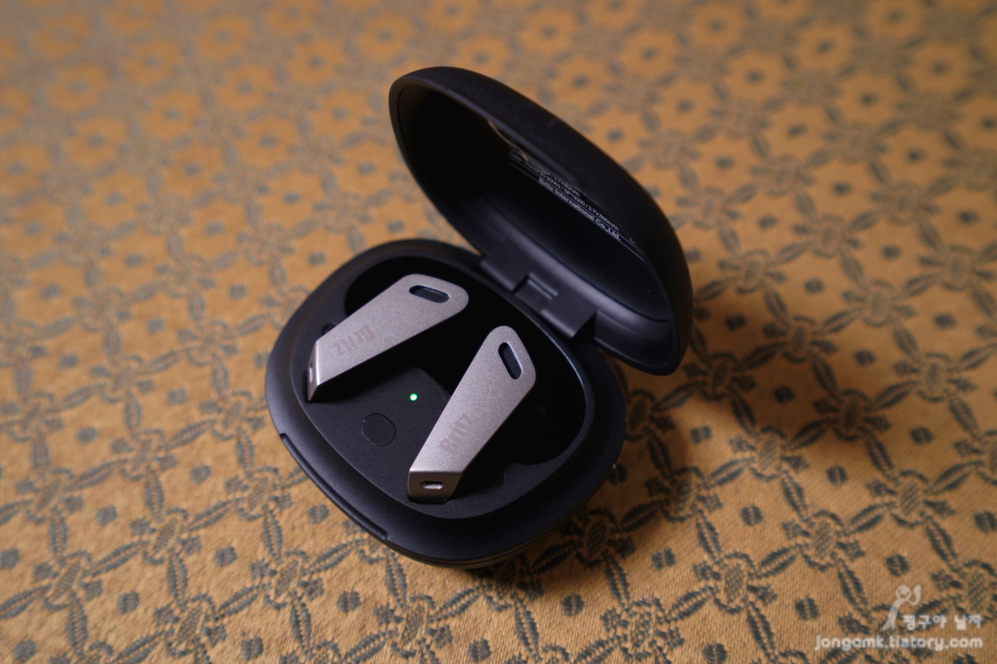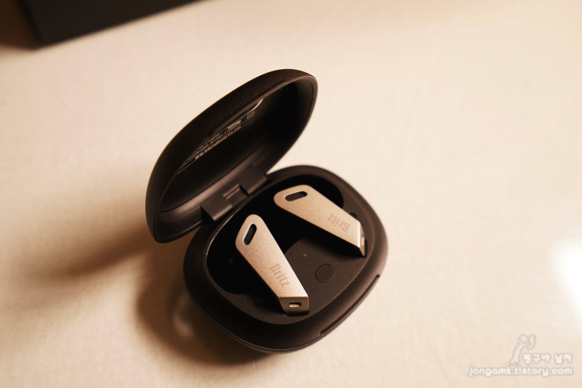 최신 스테레오 블루투스 이어폰 브리츠 어쿠스틱AN3(AcousticAN3) 블랙의 충전 케이스를 연 모습니다. 일반 무선이어폰의 모습과는 디자인부터 차별성이 있죠.
