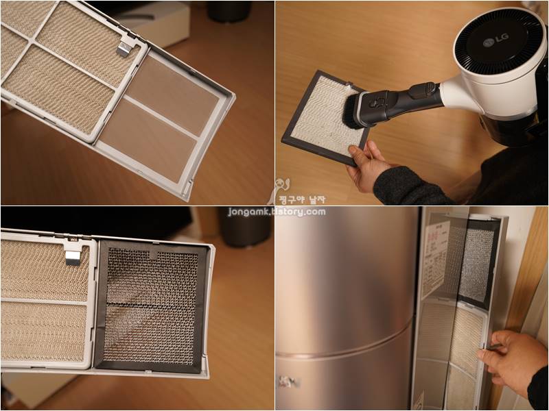 초미세먼지 필터의 교체 주기는 통상 6개월이지만 아직은 사용해도 될 것 같아 무선청소기로 먼지를 청소하고 장착해 올해까지만 사용하려구요. 깔끔하게 청소하고 건조가 된 각종 필터를 장착하였습니다. 속이 다 후련한 거 있죠. ㅋㅋ