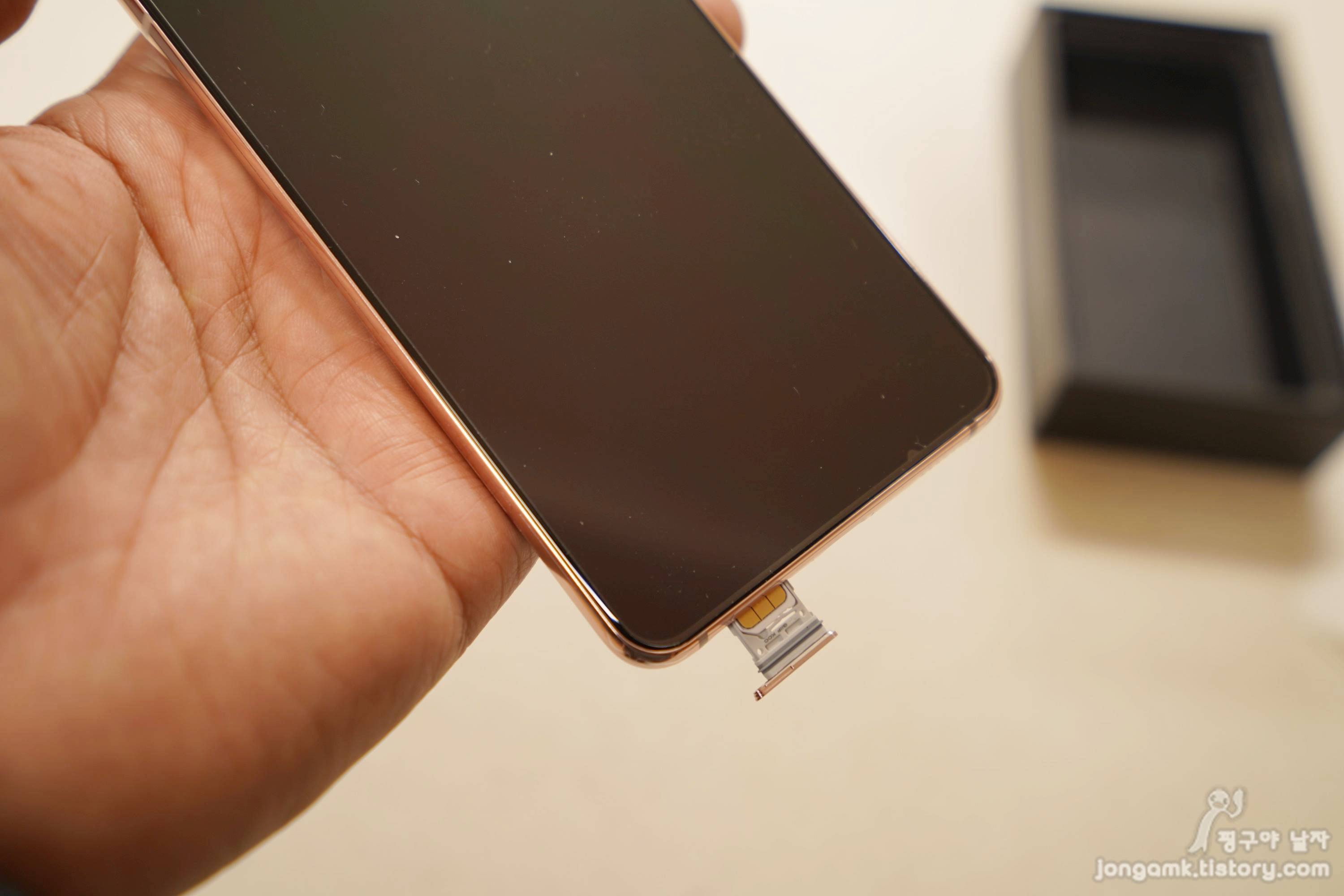 유심침을 꽂는 트레이가 하단에 있어요, 트레이가 유심칩을 걸치게 뻥 뚤려 있는 일반 트레이와 달리 장착하기 편했어요. 디테일이라고 할까요. ㅋㅋ