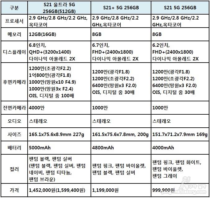 갤럭시S21, 갤럭시S21 플러스, 갤럭시S21 울트라의 스펙입니다. 비교해 보면 역시 갤럭시S21 플러스와 가격 차이가 20만원이이라 고민을 하게 됩니다.